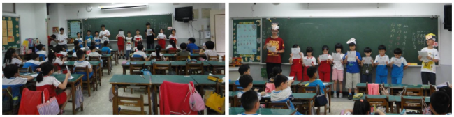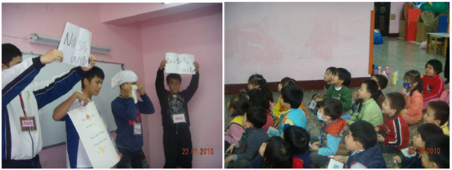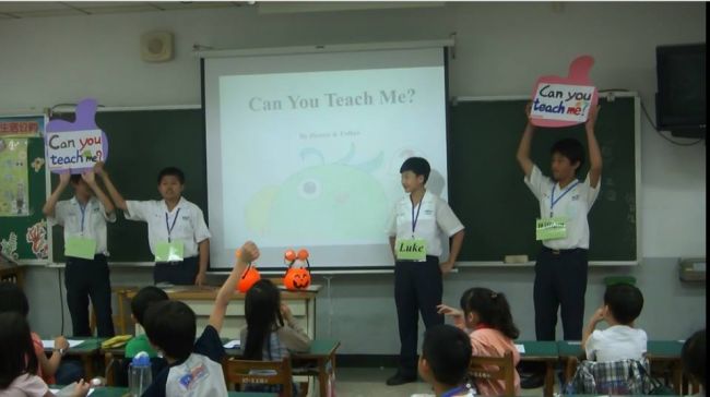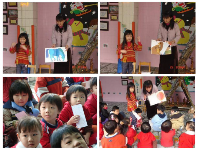 兩年後,學校指派我接兩個國三補救教學班。因為參加了徐美雲老師的繪本說故事研習,喚起了我那段女兒繪本說故事的美好回憶,所以決定依樣畫葫蘆,讓同學們4人一組,到托兒所擔任故事哥哥,說演英語繪本故事。原本抗拒英語的同學們,在我逐步引導下,各組研讀繪本,討論演出,在每週一堂的補救教學課,輪流上台演練。終於在上學期末,兩班7組28位同學,完成了到托兒所說故事的任務。