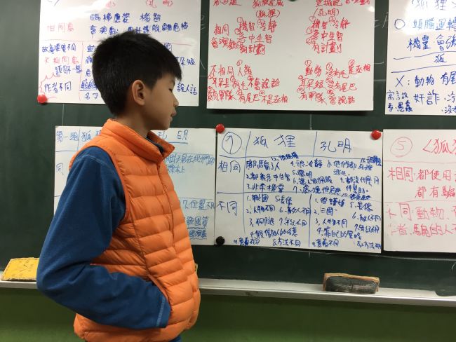 又問「喜歡孔明的機智請舉手?」這時,絕大多數的人都舉手,老師問:「為何人們對孔明讚譽有加卻對狐狸印象不好呢?這中間是不是有什麼誤會?」學生一時也說不上來,於是請各組利用十分鐘腦力激盪討論狐狸及孔明的異同處,鼓勵學童寫越多(流暢性)分數越高,若能看出獨特之處小組分數加碼送(獨創性)。