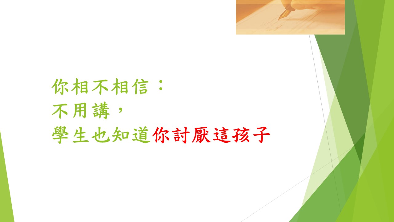 所以我總是先去同理學生的「框架」何在,這樣子才有可能對症下藥。我們就是孩子能改變自己的一個機緣,弱勢學生、特教生、家長都易陷入一個「框架」,我就是不好,所以不會很正常、我就是愚笨,所以不要找我做事、孩子就是不好,那就這樣吧……