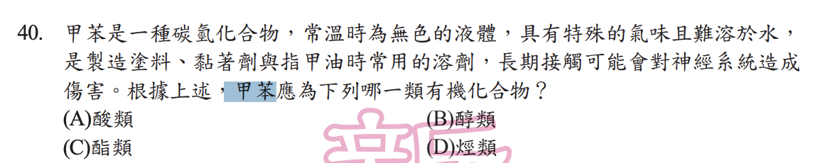 若只注意到「有特殊氣味」選了酯類,而忽略第一句話的關鍵字「甲苯是一種碳氫化合物」,便可能粗心答錯。