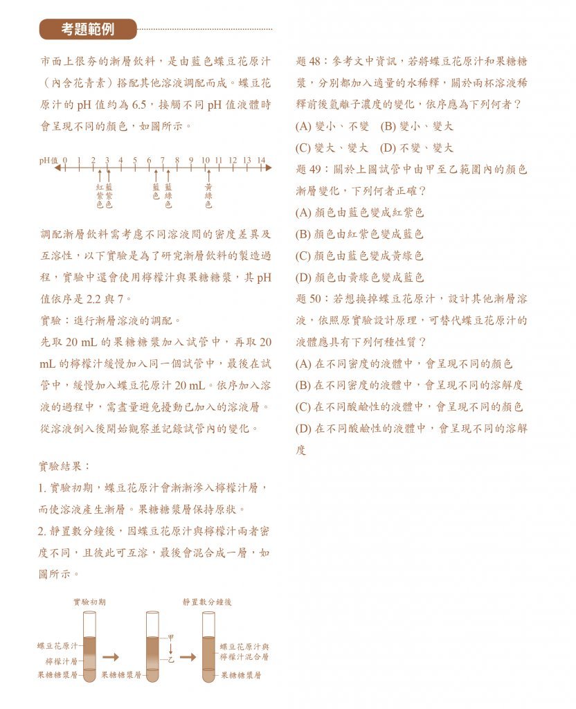以最新參考試題本題組48~50題漸層飲料的pH值為例,學生要理解實驗主體架構和脈絡,掌握題目要考什麼概念。以往學生死背pH值及顏色變化或是實驗步驟等,已派不上用場。考題會直接提供資訊,重點是能否探究、分析實驗圖表及數據,並結合課堂所學知識應用在生活中。在考題裡,學生要能看懂實驗報告,並運用所學知識,連結題幹提供的資料作答;甚至要有邏輯推理能力,從題目所提供的實驗報告或參考文獻,推敲答案。