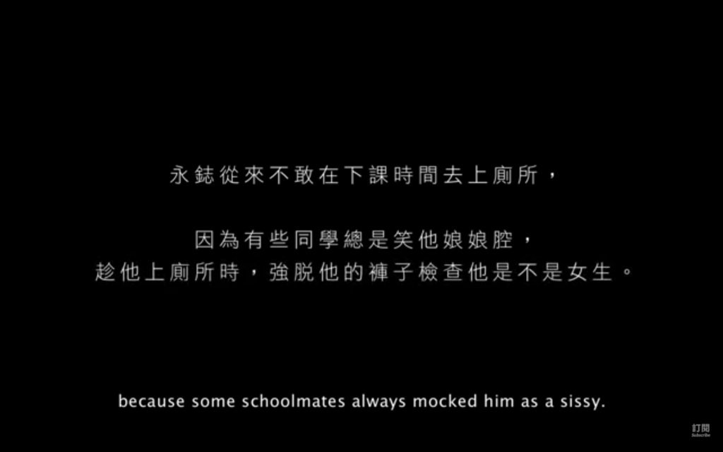 葉永鋕是一個性別氣質較陰柔的孩子,從小喜歡做菜、喜歡唱歌,卻因為這樣的特質,讓他在就讀國中時,飽受言語與肢體霸凌。他經常受到班上同學嘲笑「娘娘腔」,甚至被捉弄、欺負,就連下課上廁所都會被同學強行脫褲子「驗明正身」,導致他再也不敢在下課時間去上廁所⋯⋯。