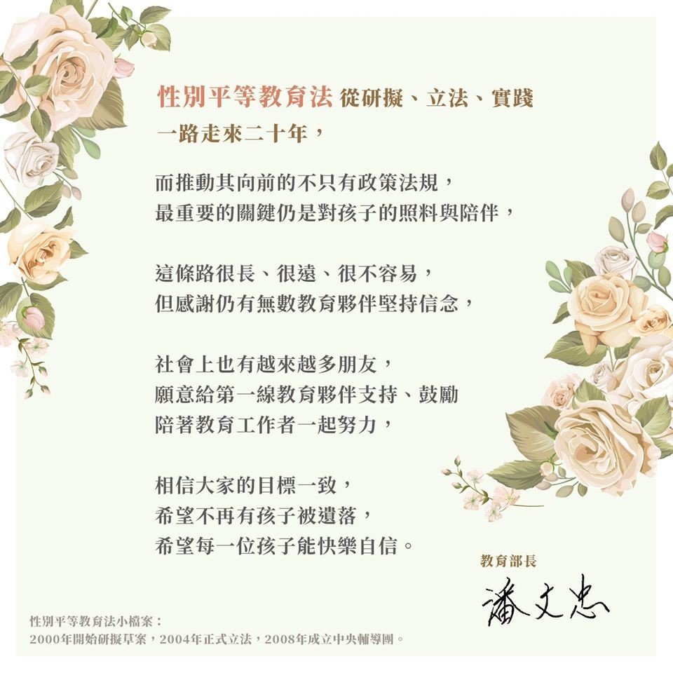 「《性別平等教育法》的正式立法,為的是透過教育,讓孩子避免因為不了解,而產生歧視、偏見、霸凌與暴力;教孩子認識差異,讓尊重、同理、包容成為教室內的風景;並陪伴曾受過傷的孩子,走出傷痛、了解自己、重新喜歡自己。」潘文忠說。