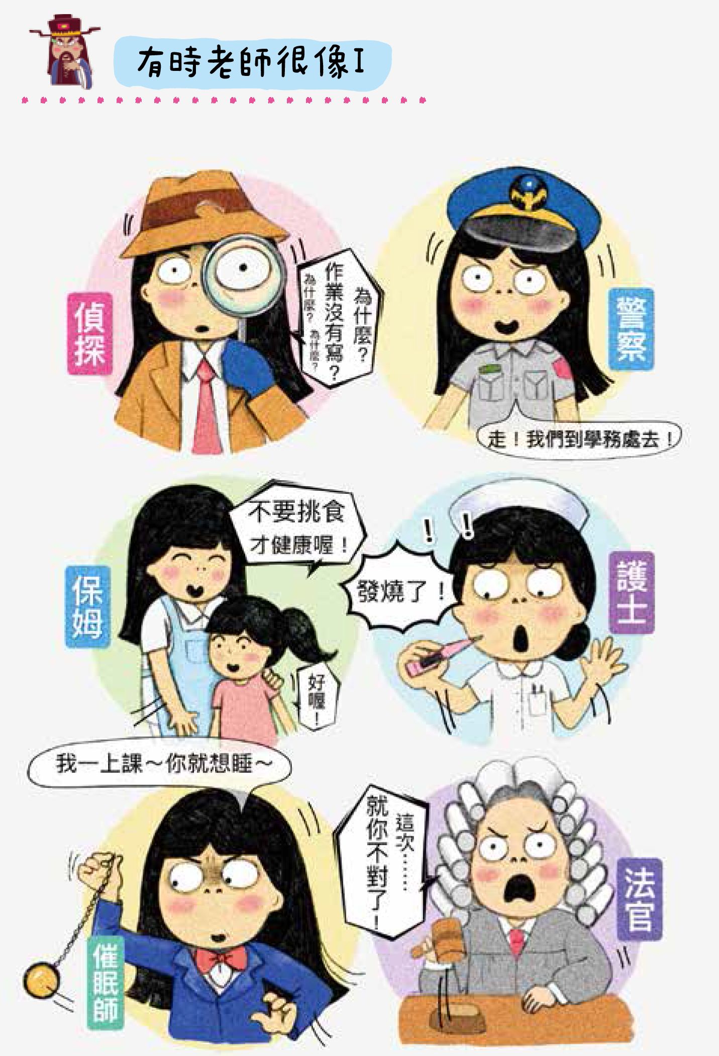 各位老師有被孩子錯叫成媽媽的經驗嗎?其實老師的工作,可不只是像媽媽而已!蔡詩芸老師幽默畫下「有時老師很像⋯⋯」的系列圖文,像法官、像靈媒⋯⋯一個個趣味又貼切的形容,讓老師不禁大笑:「真是說到心坎裡!」