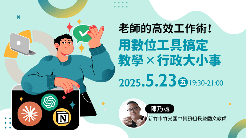 總是被行政與教學瑣事追著跑嗎?翻轉教育最新研習,邀請講師從校園第一線應用情境出發,帶你認識 AI 生成工具、Notion 整理術等數位工具應用方法,幫助解決老師日常困擾,省時又省力 點我立即報名>>