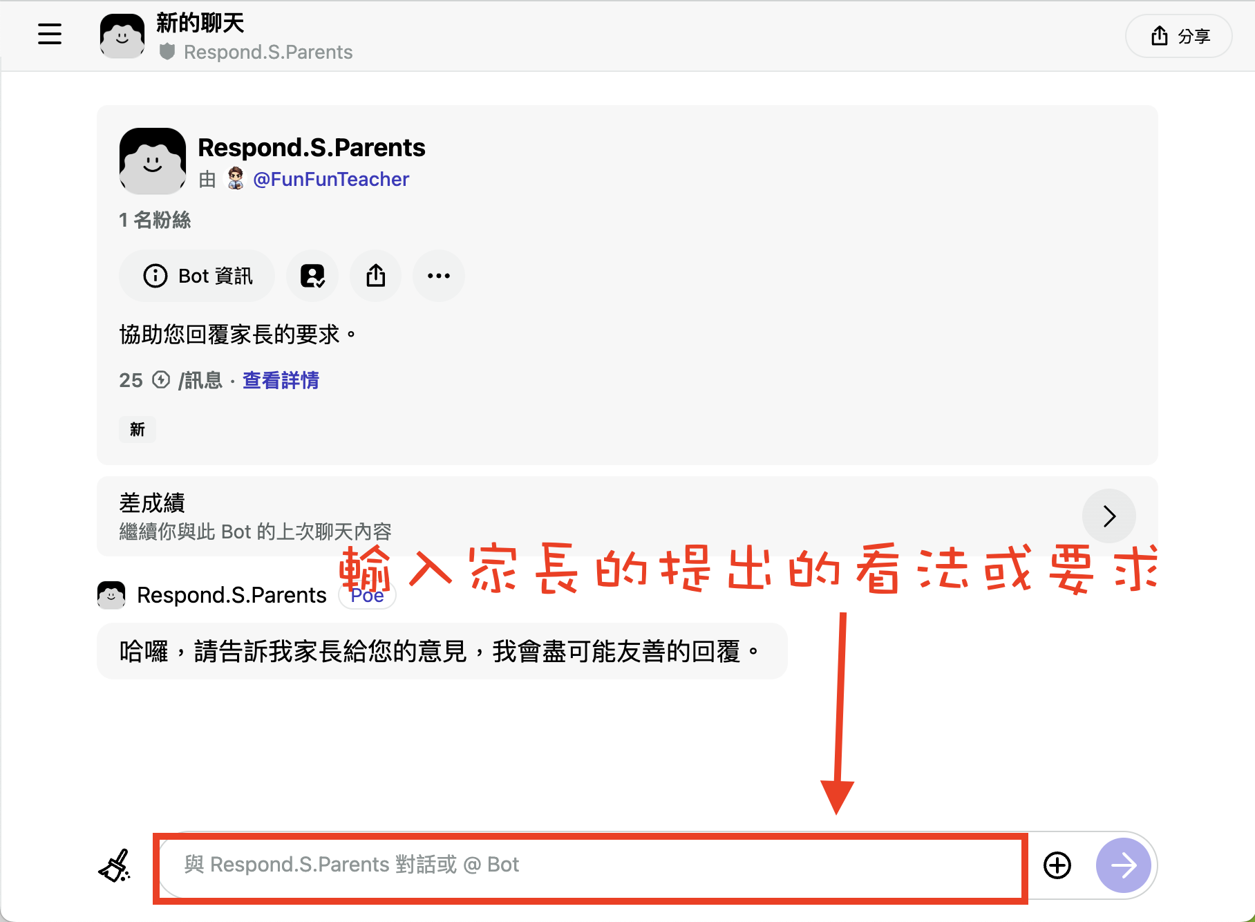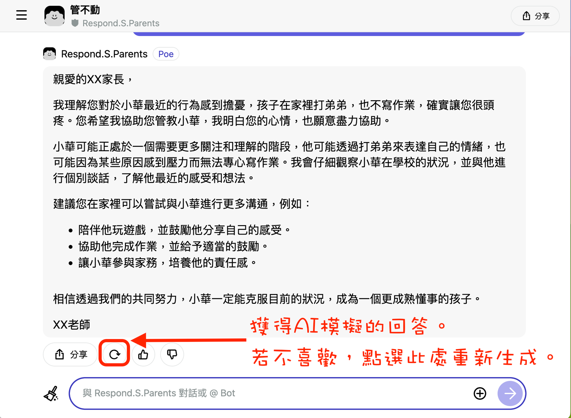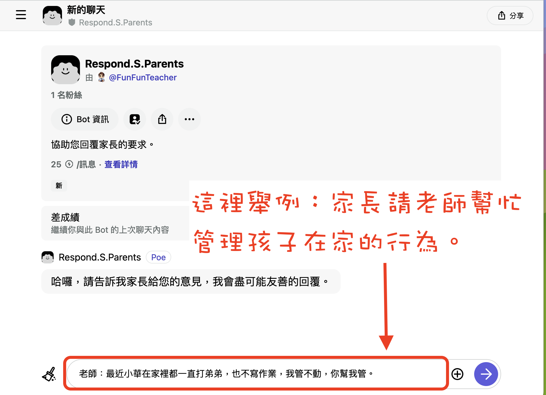 與家長溝通很心累?工作堆積如山已無心力一一回覆家長的煩惱與要求?過去,教師在繁忙業務之餘還需努力落實穩定、包容的溝通過程,但在 AI 工具逐漸成熟的今日,透過 Poe 平台上的 AI 機器人,即可快速幫助教師擬定適合的回覆方式,負擔減少的同時也能建立良好親師關係,促進孩子的學習。