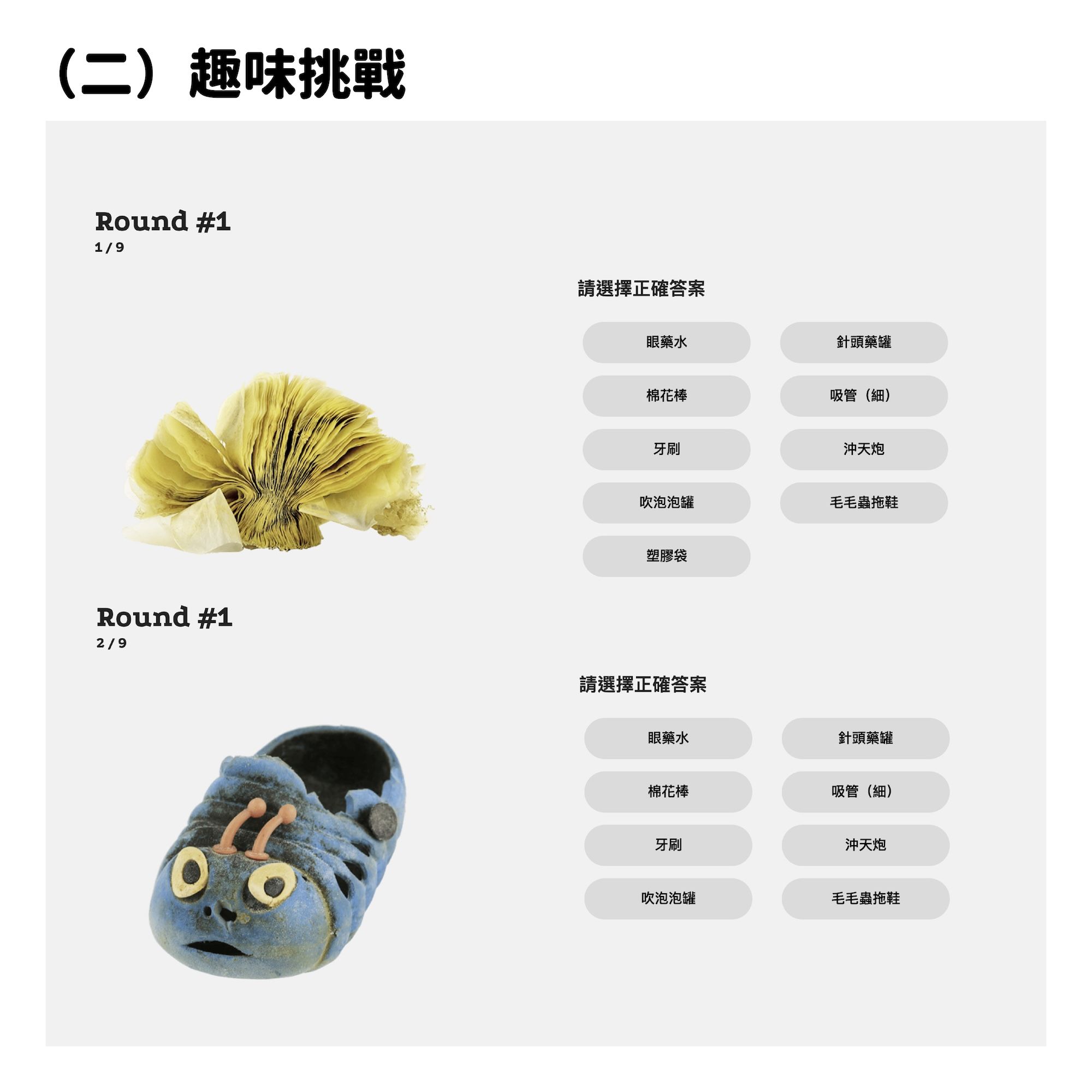 透過海廢圖鑑中的「海廢大挑戰」,分組互動或競賽方式,可觀察海洋垃圾在經過海水浸泡及陽光的曝曬後,樣貌為何。