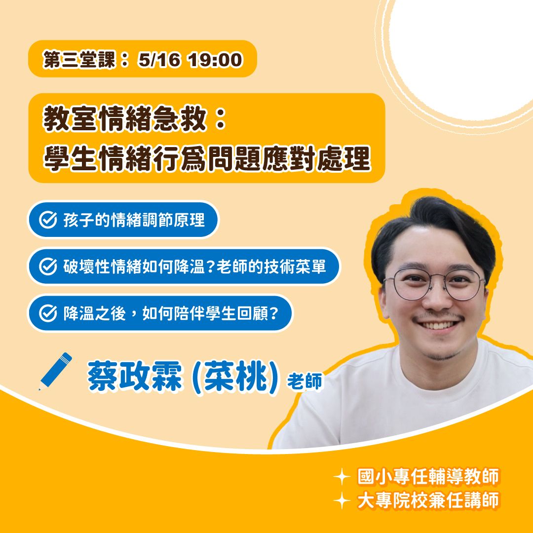 菜桃老師將於課程中分享孩子的情緒調解原理,幫助教師了解應對學生情緒行爲問題,有哪些關鍵的處理原則、技術菜單。點擊圖片了解更多