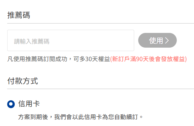- 新朋友只能使用一組推薦碼,且僅能用在首次訂閱時