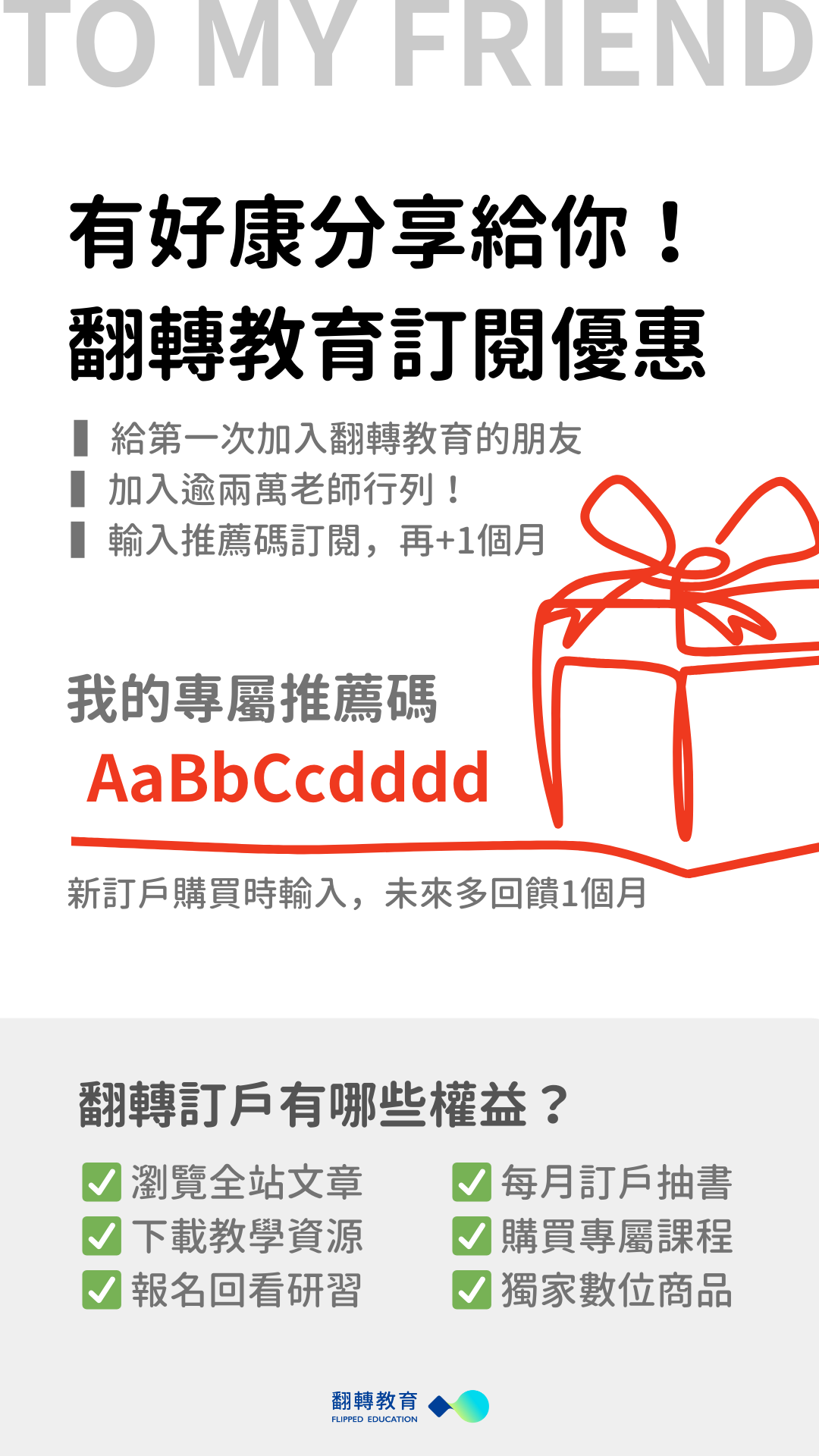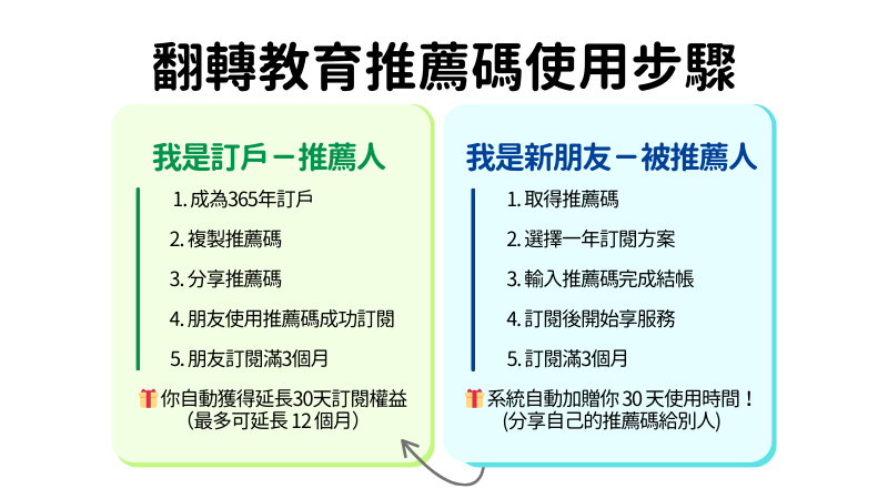 如果你是第一次加入翻轉教育的新朋友,恭喜你!你可以使用推薦碼來獲得額外 30 天的訂閱權益!