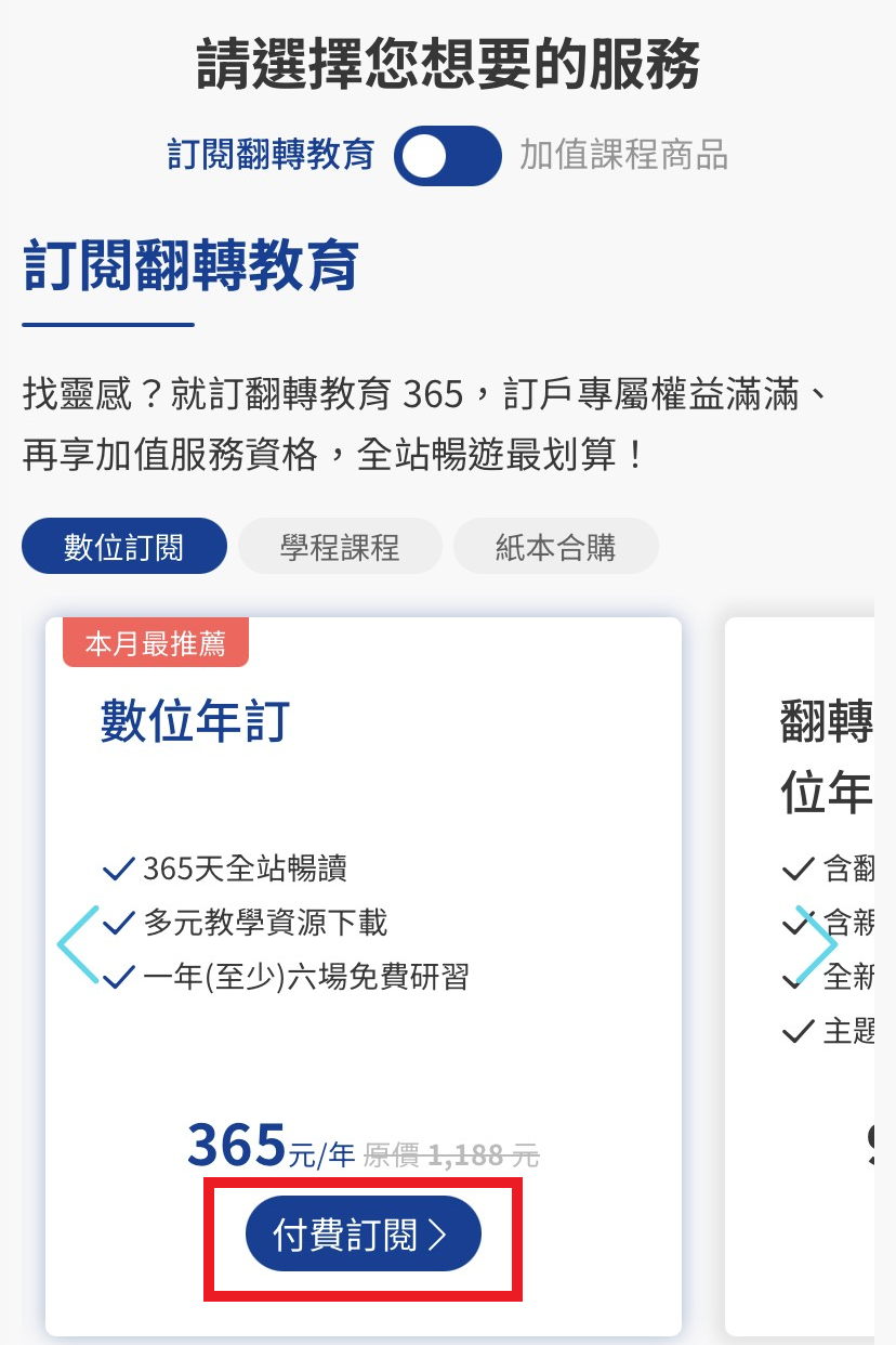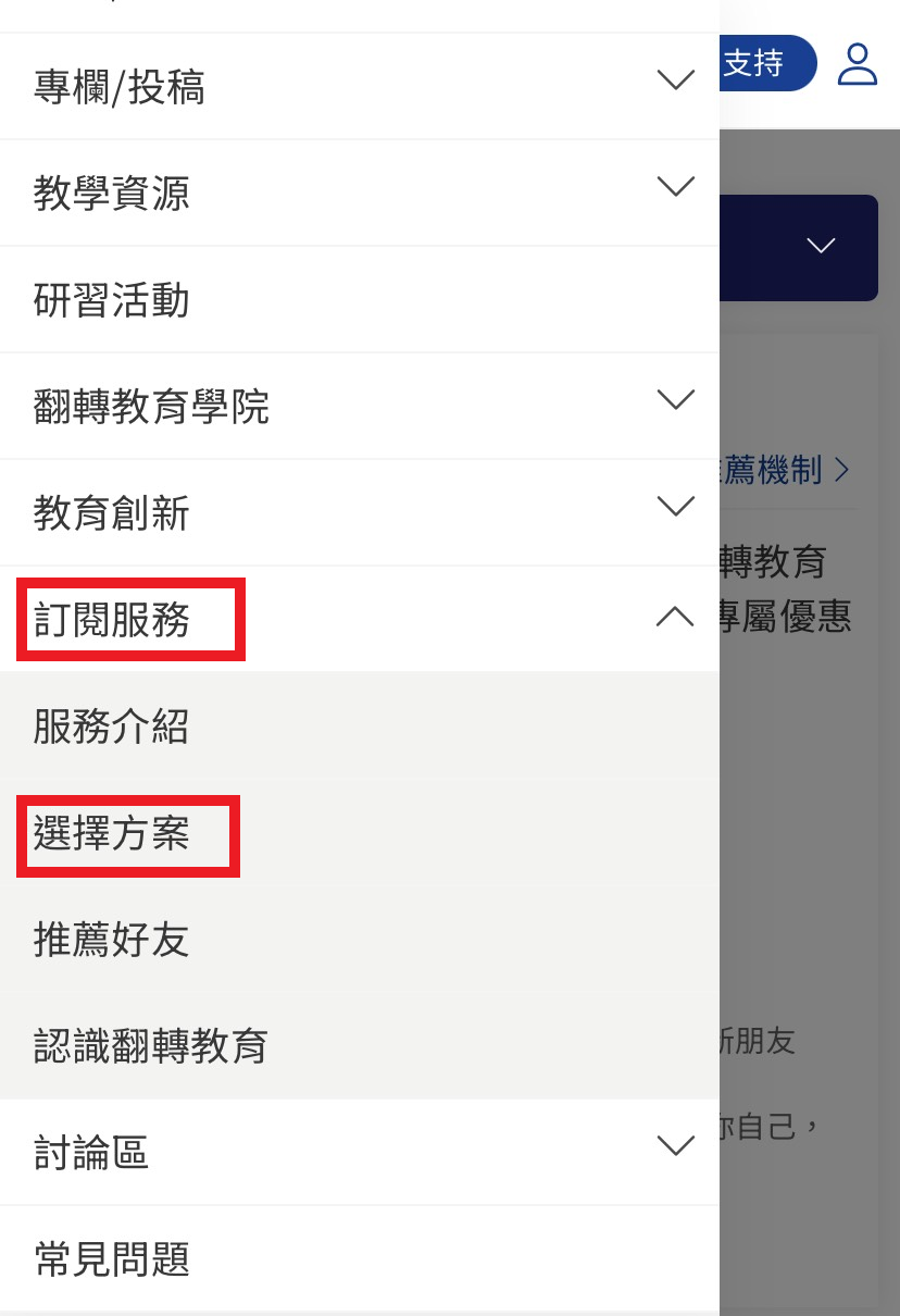 - 前往翻轉教育網站,在選單上找到「訂閱服務」,點選「選擇方案」