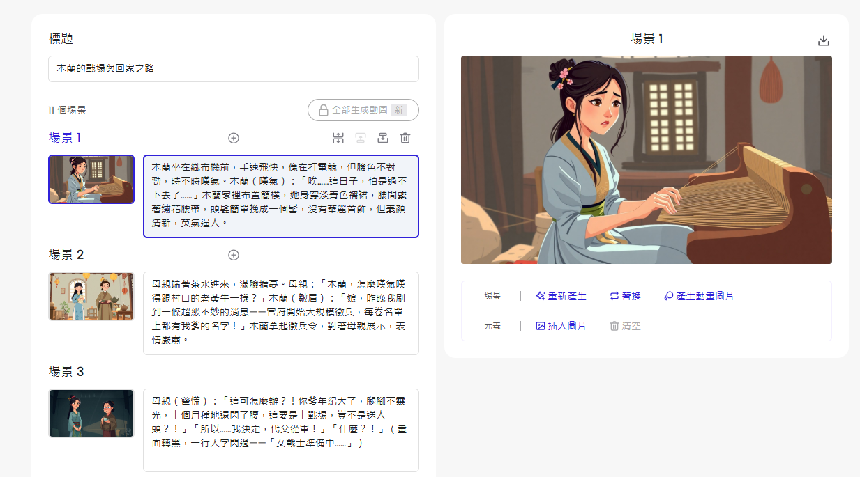 登入Mootion AI後,點選左方的「通用內容創作」,開啟對話框後,如果是用自己的文稿,可點選「使用我的文稿內容」,以〈木蘭詩〉為例,學生可以輸入指令設定背景為「中國古代」,然後貼上白話翻譯的文字,或者讓學生先自行改寫文字,增添更多細節描繪,再貼上修改後的文字。輸出語言可選中文,AI 頭像可自行選擇,或選無頭像。接著選擇比例和視覺風格後,按右上角的「產生」鍵。就會出現如下畫面: