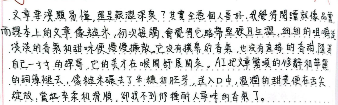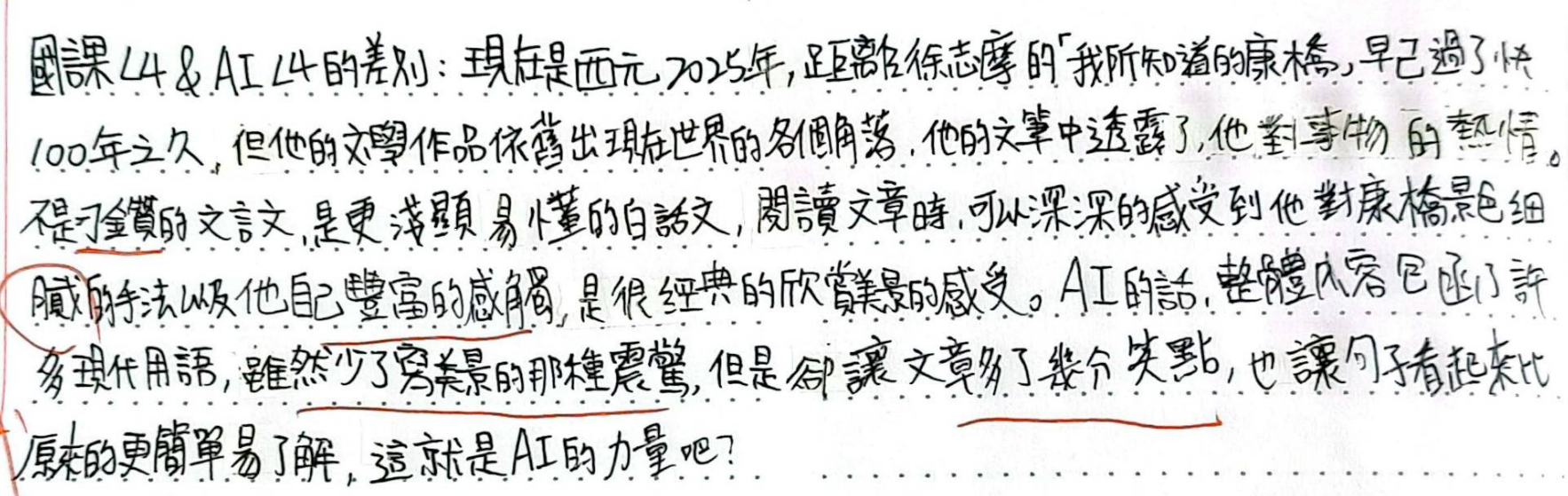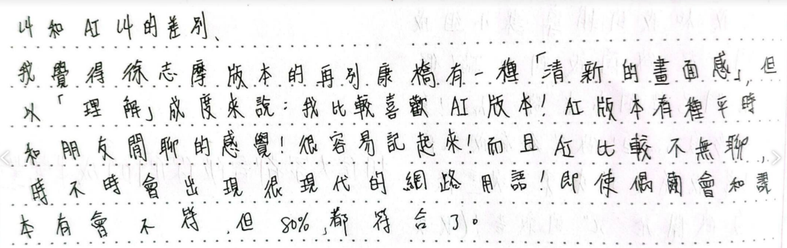以上兩位同學很細膩的比較了兩者的閱讀體驗,並體會到改編文章所流失的某些元素。徐志摩的文章除了上述的詞彙、寫作風格等具有強烈時代性外,加上其文章冗長,且文字堆砌,教學上並不容易,透過AI的改編能讓學生更輕易地理解兩者之間的差異。