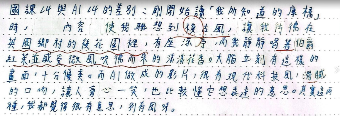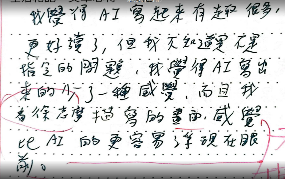 三位同學或覺得AI改編版本較為有趣,或更易理解,同時感覺到兩者的差異,「徐志摩描寫的畫面」之所以讓學生感覺到「比AI的更容易浮現在眼前」,這就是細節描寫的力量,AI改寫則少了很多寫景的細節描寫。有些學生細膩的比較了兩者的閱讀感受: