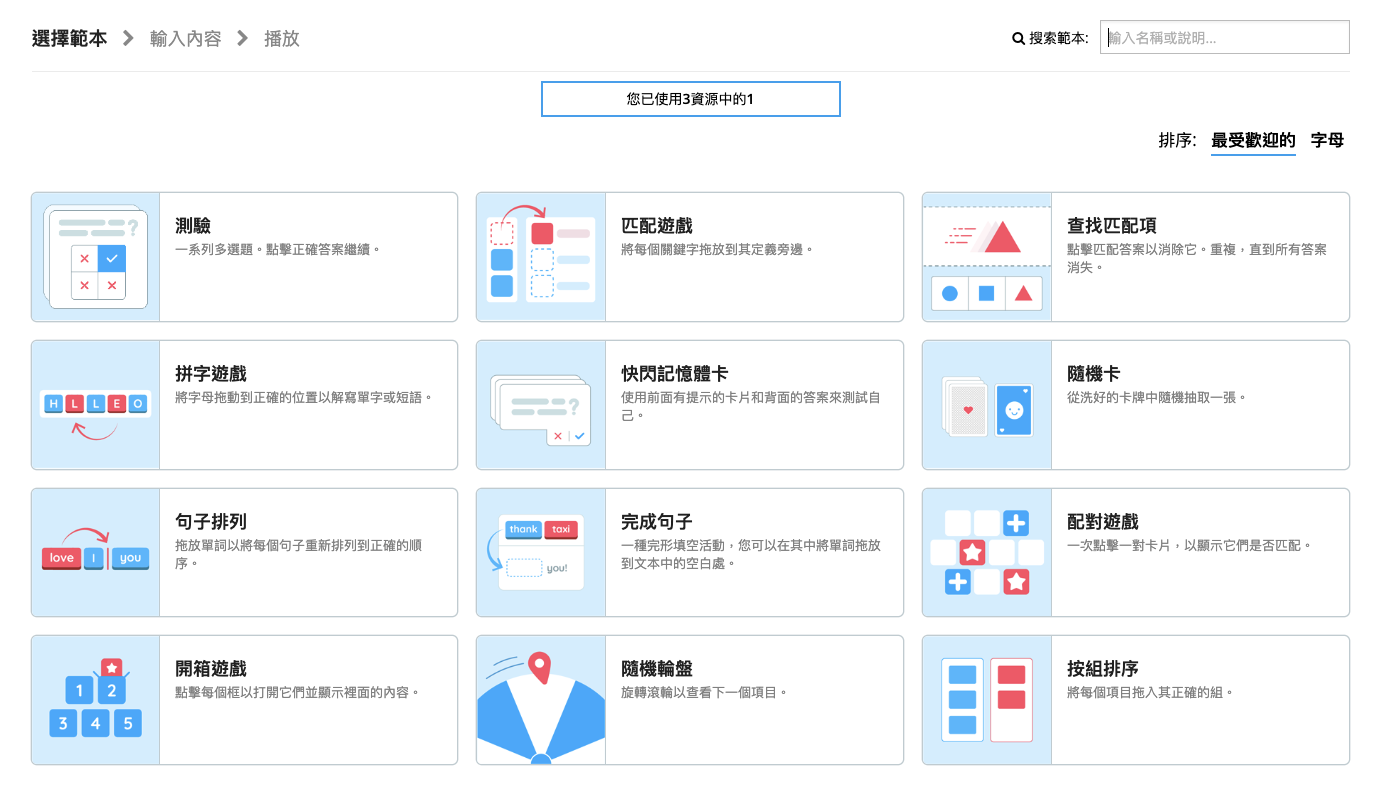 免費版共有三個活動空間可創建,若已滿後需要更改題目,直接編輯舊有的活動即可,勿刪除以建立的活動。可根據課堂需求選擇適合的 Wordwall 模板。