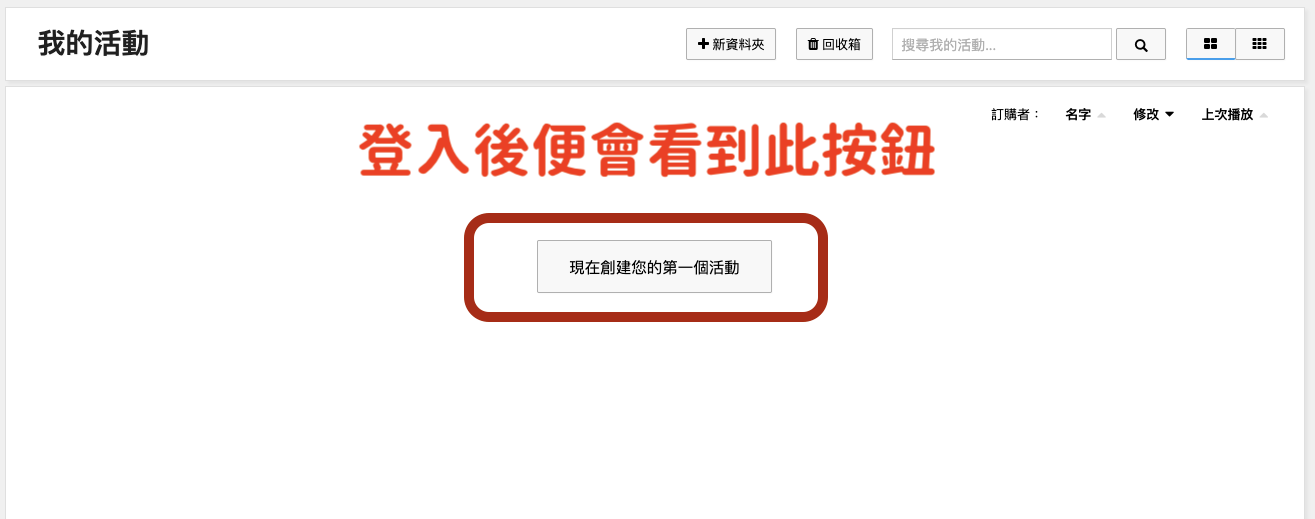 - 登入後於主畫面點選「創建第一個活動」