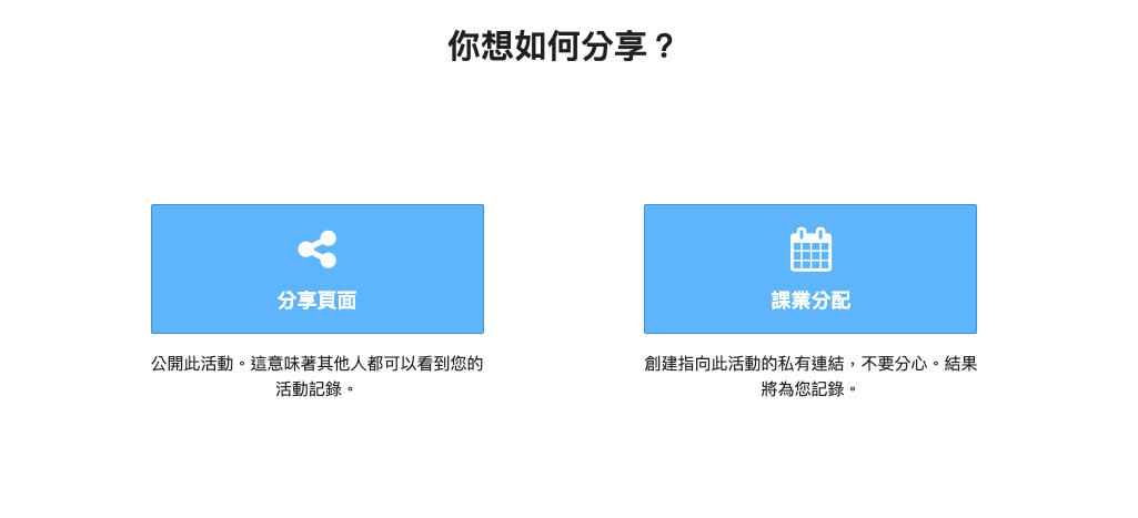 測驗建立完成後,點擊右下角「分享」,可選擇分享頁面。與教師們共同分享測驗內容。同時,各大出版社(翰林、康軒)皆有製作課程測驗,可直接使用於課堂。