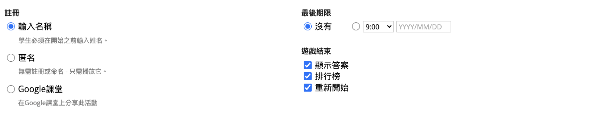 - 設定期限與答題方式,若平時使用 Google classroom,亦可連結至教室。