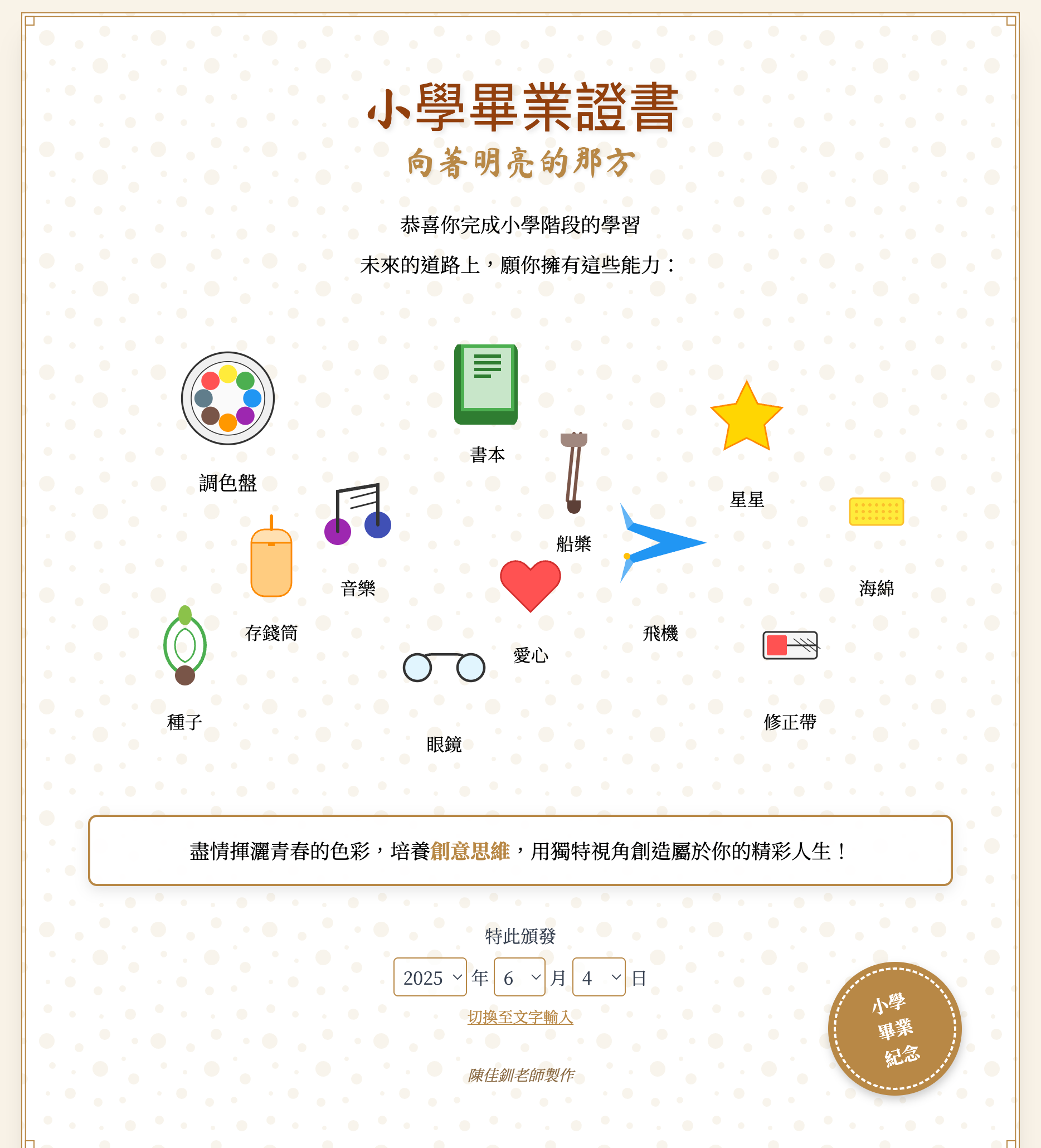 • 情境需求:每一個圖案、每一句話,都是給孩子們即將啟程的祝福與引導。每一張證書都是獨一無二的祝福,滿載情感價值。也可以搭配【面對未來,我應該具備的能力(103年會考題目)】延伸寫作,讓學生寫下自己的想法。