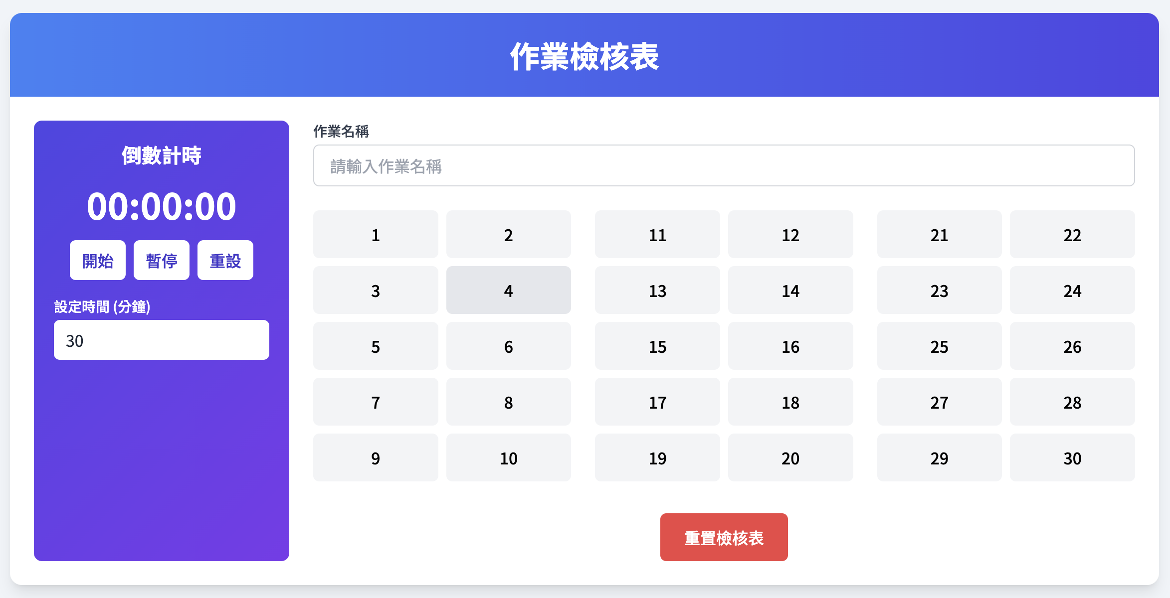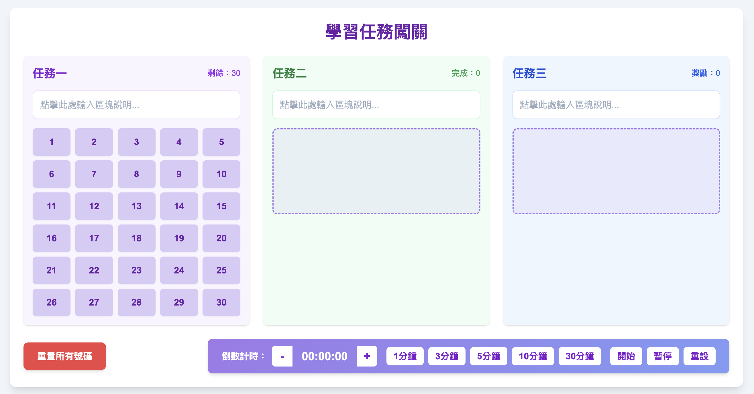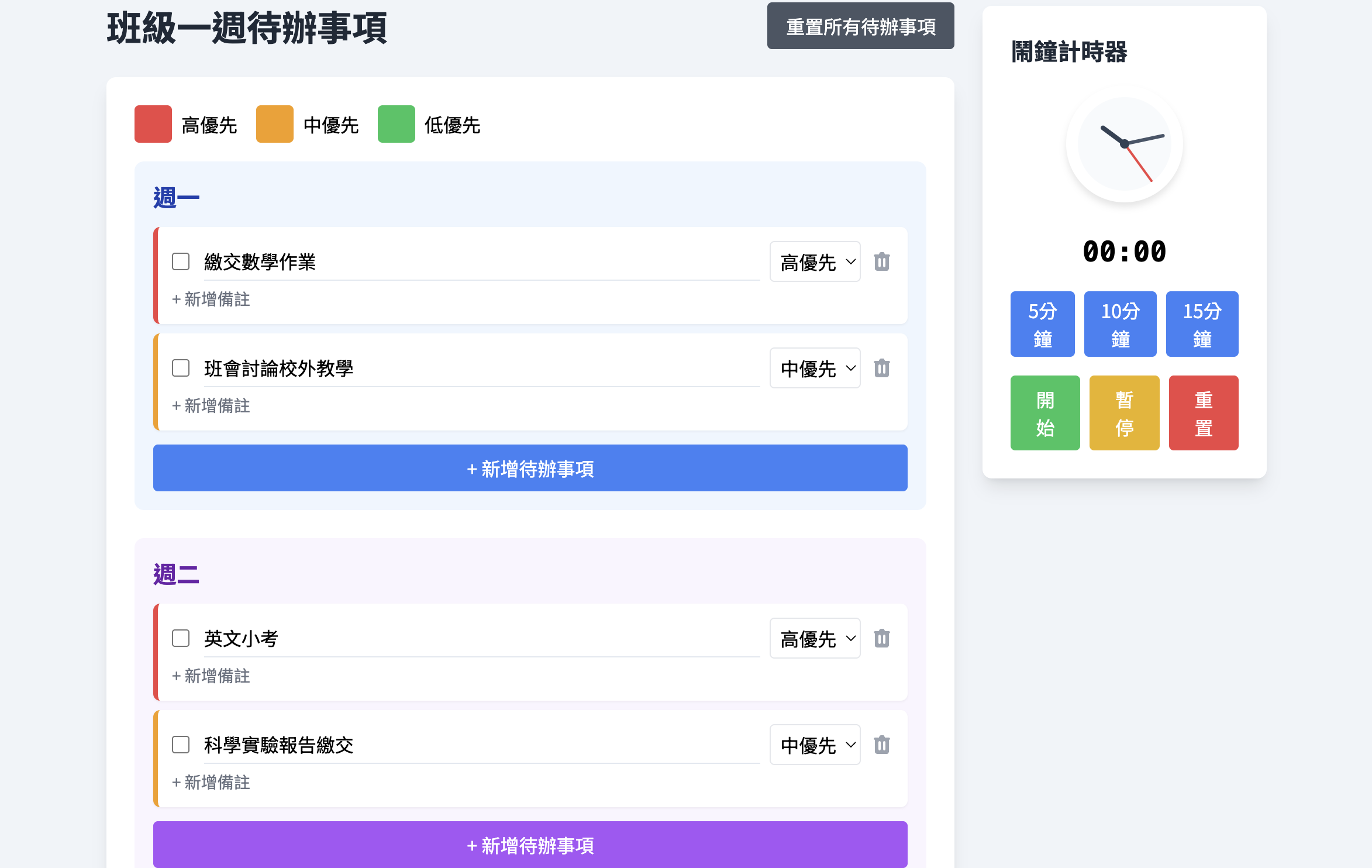 • 設計構想:用「作業檢核表+計時器」讓學生能自行勾選繳交情況,也能看到時間壓力,讓作業管理更自律。