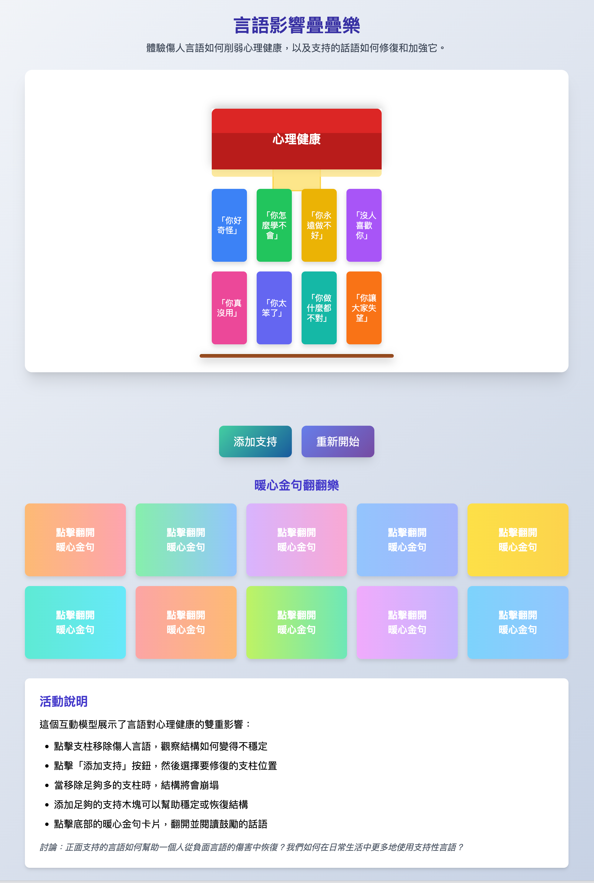 CANVA AI 自製班級經營小工具:言語影響疊疊樂。圖片截取自陳佳釧老師自製小工具。