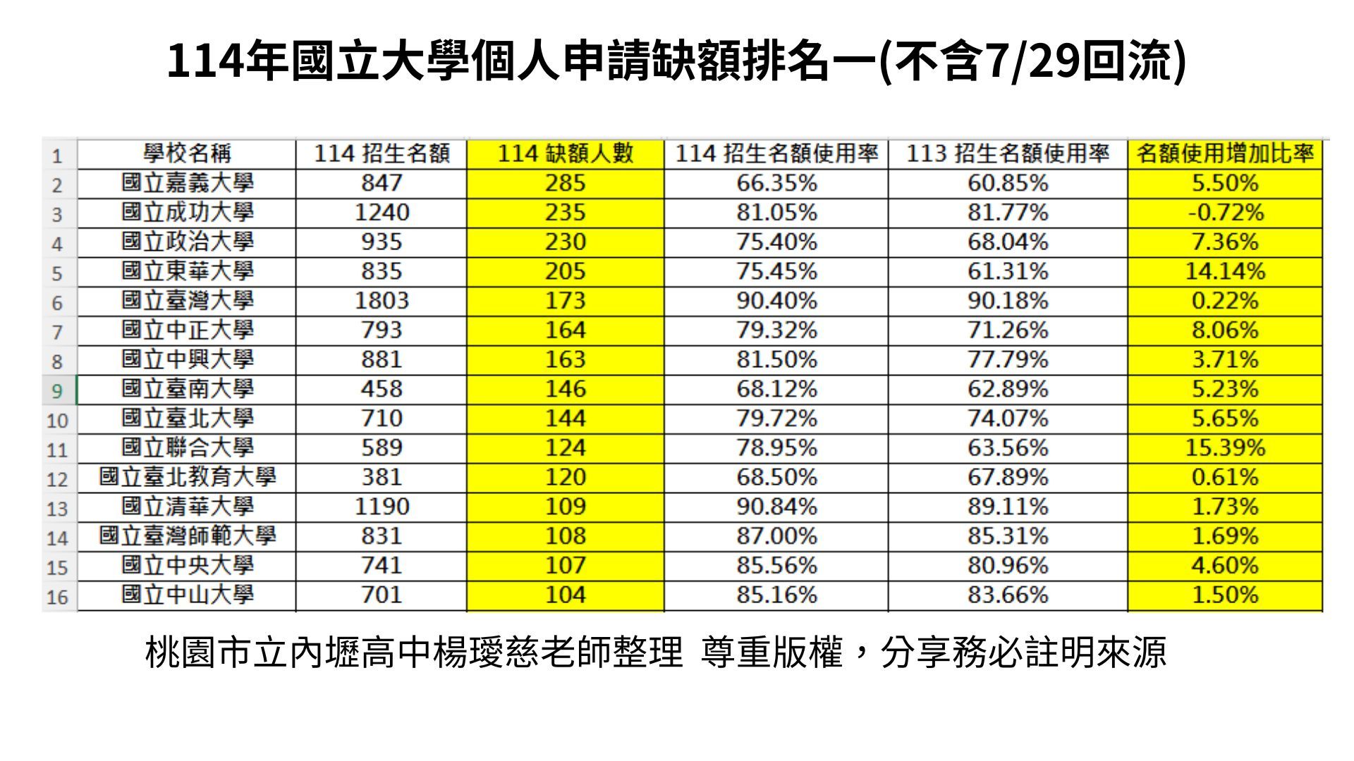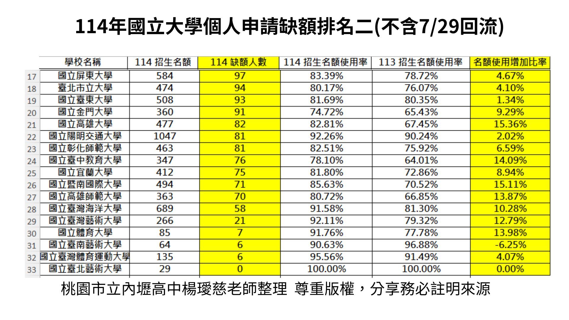 六、114 vs 113國立大學個人申請缺額比較表