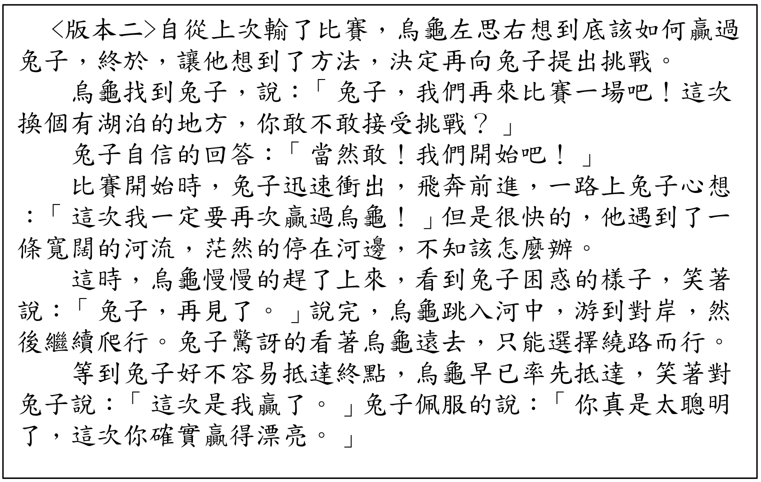 7. 請學生們分享他們喜歡哪個版本的故事?想一想除了烏龜贏、兔子贏,還有沒有其他結局的可能性?