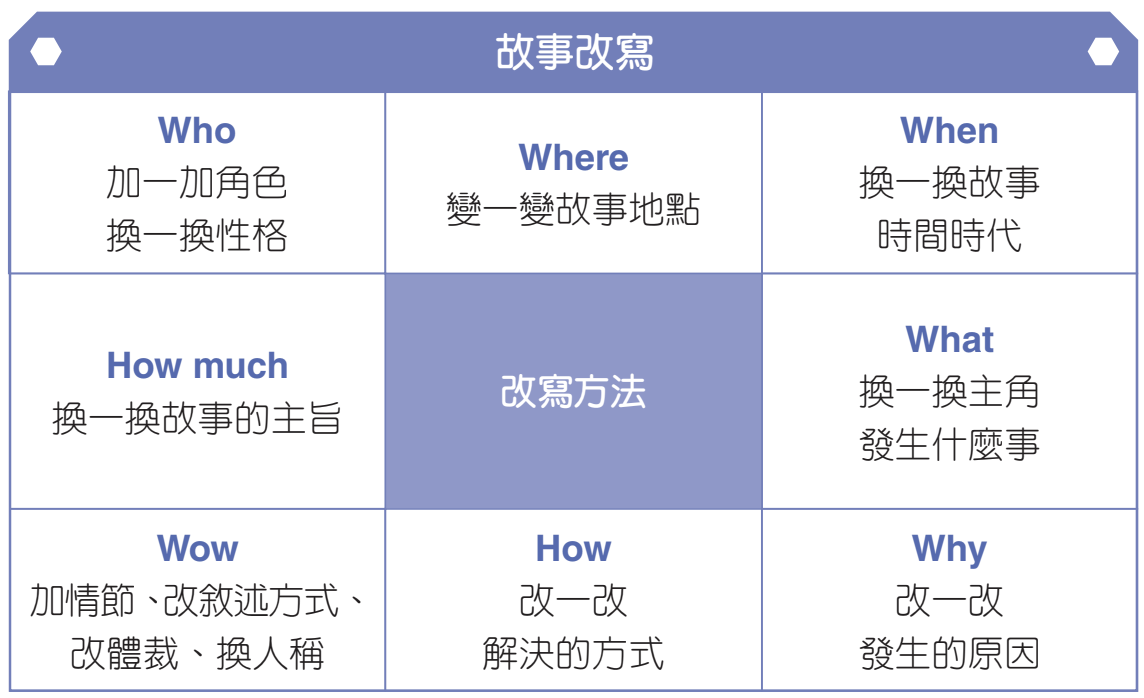 8. 教師可以繼續分享《龜免賽跑》、《超級烏龜》的故事,最後引導討論每一個故事改寫的方法是什麼,歸納方法如下。