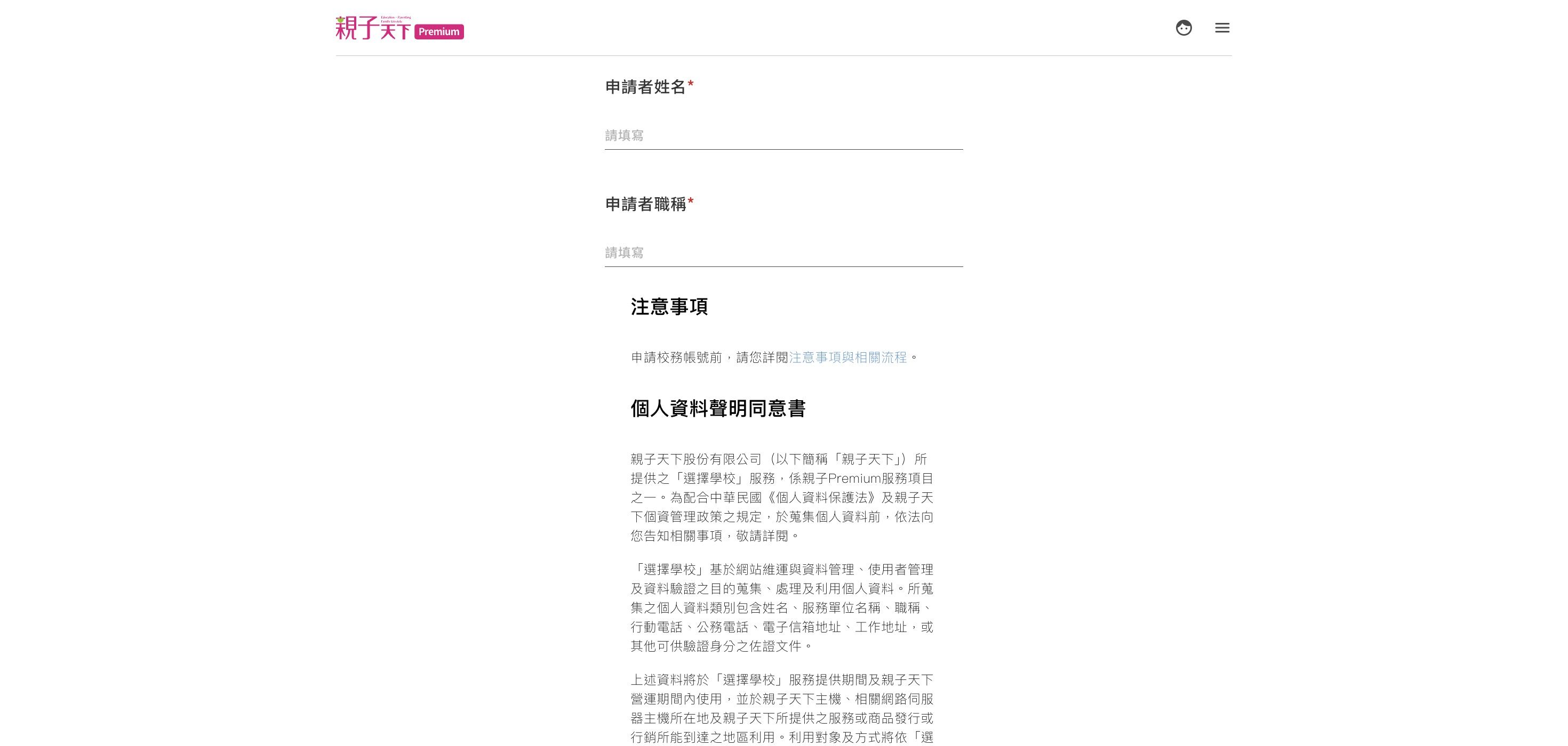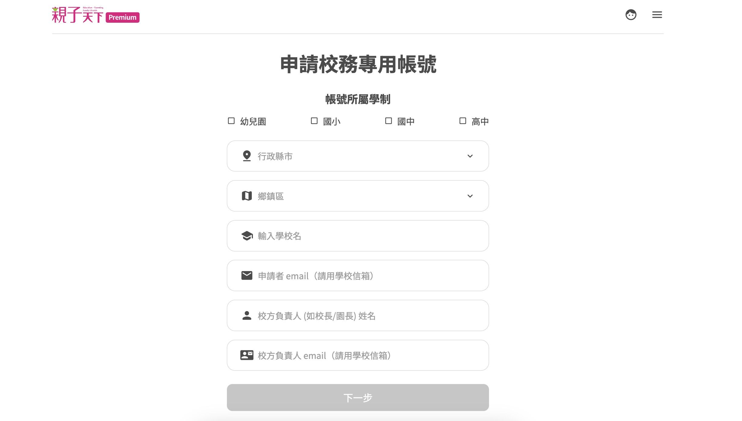 - 學校所屬學制:若學校同時包含兩種學制(例如國中與國小),請先完成一個學制的申請,後續再與我們聯繫進行後續申請。