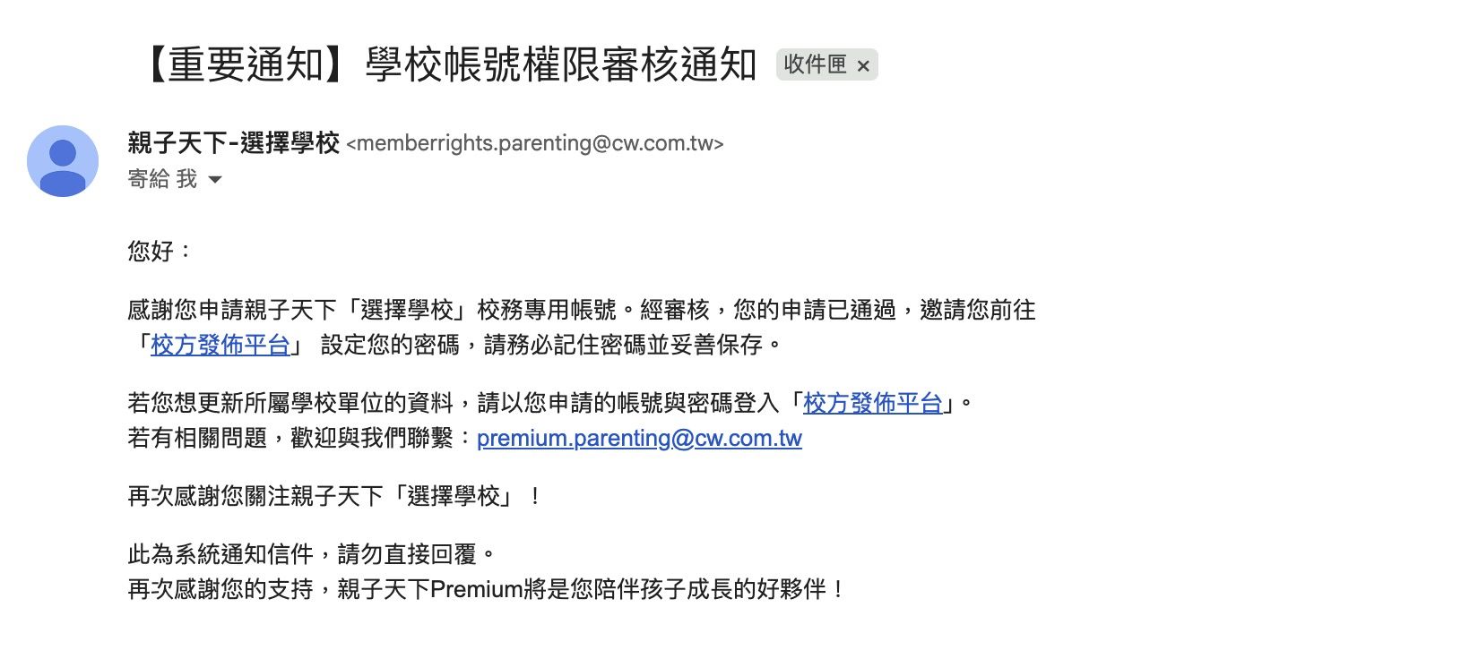 審核完成後,您與校方負責人將會收到親子天下「選擇學校」的帳號權限審核通知,表示申請已通過。