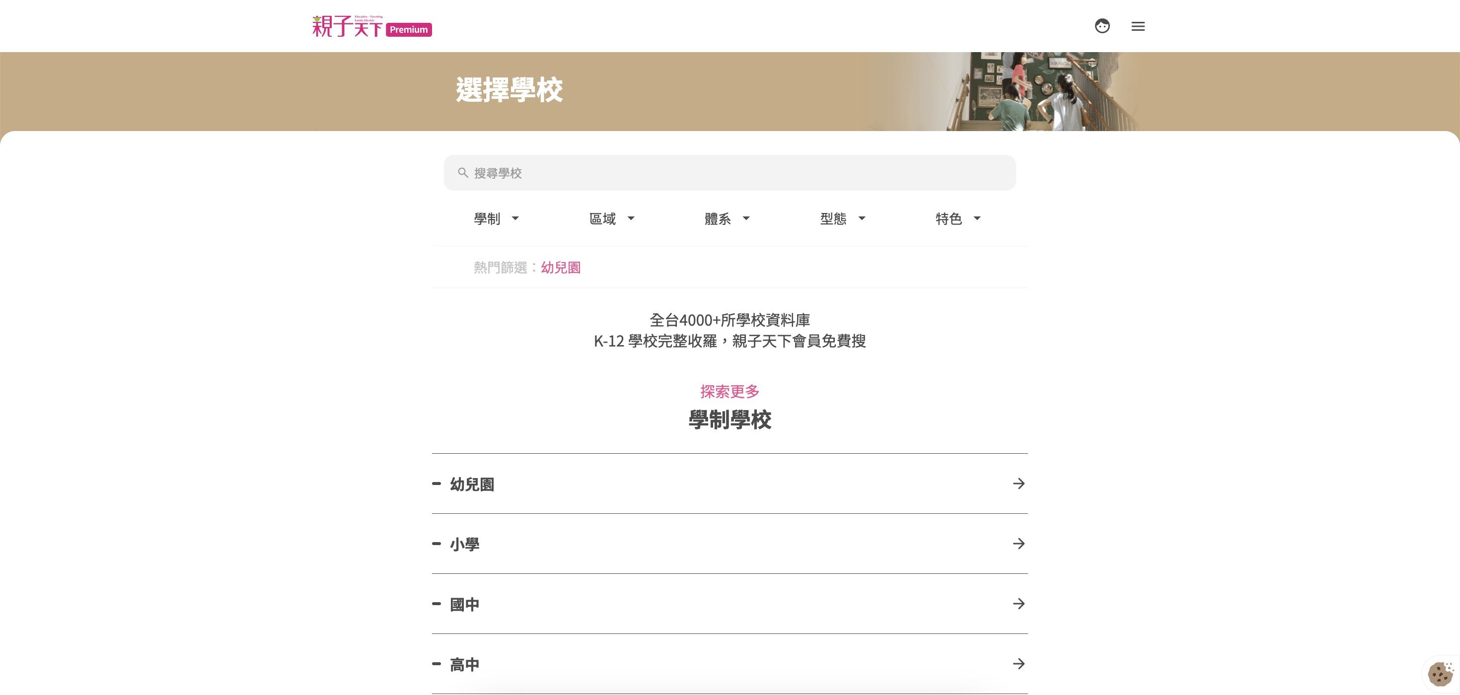 親子天下 Premium 「選擇學校」是專為家長搜尋與認識學校而打造的平台,資料庫收錄幼兒園、國小、國中、高中等豐富資料。讓家長可依學制、學校類型、特色等條件快速篩選,並深入了解課程、收費與辦學亮點。