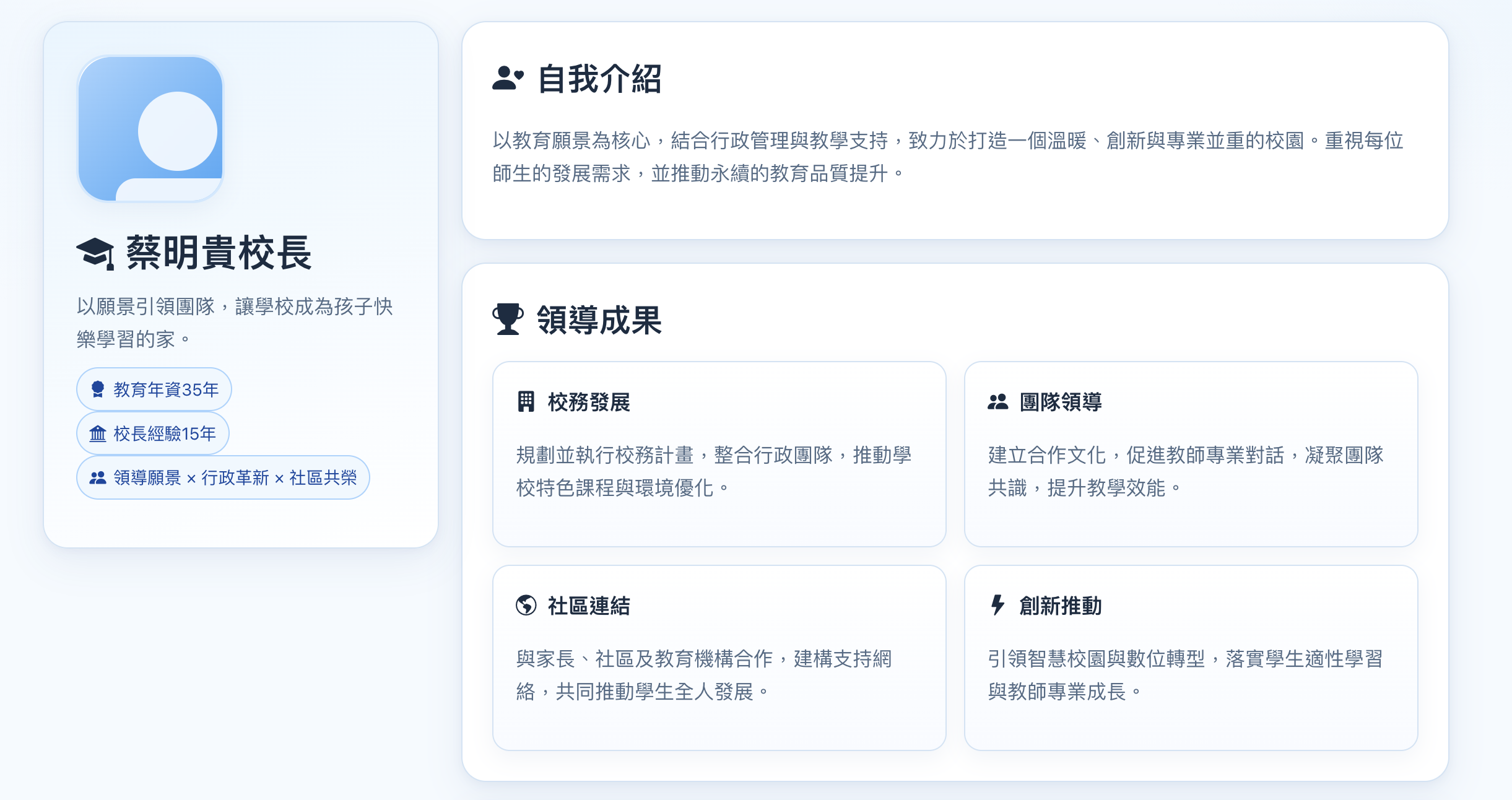 不用寫程式即能生成自我介紹網站,呈現教育理念與專業成果,支援校長、老師、行政人員快速打造個人專頁。圖:阿貴校長示範網頁