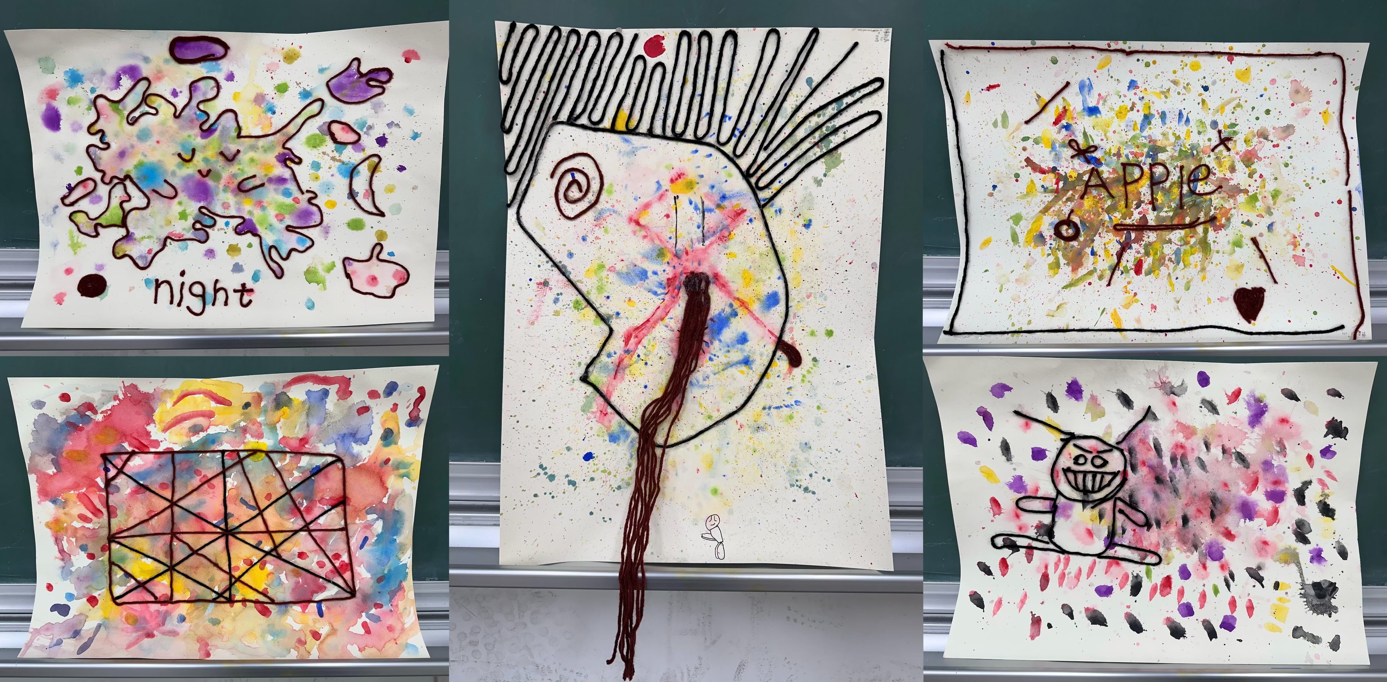 第二階段,我發給孩子毛線和保麗龍膠,邀請他們重新看待剛才的水彩紙。這一次,他們要觀察顏色與線條,並利用毛線去延伸、發展新的畫面。