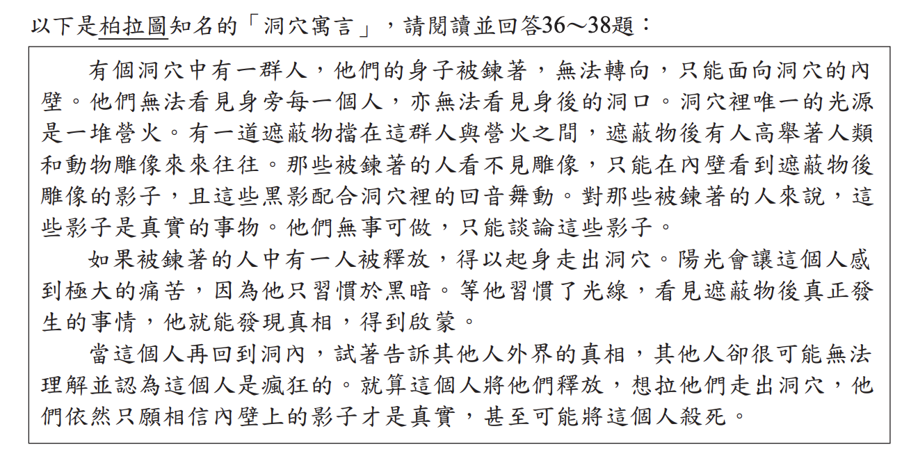 國中教育會考111年有個題組使用的文本是柏拉圖的洞穴寓言,這個故事描述的是描述一群囚犯被綁在洞穴中,他們從出生起就只能看著後方的牆壁。牆壁上的影子是他們唯一能看到的事物。囚犯們認為這些影子就是真實的世界。有一天,一個囚犯掙脫了束縛,被迫走出洞穴。起初,他無法適應強光,覺得刺眼。但後來他逐漸適應,看到了真實的物體,最後甚至看到了太陽。囚犯決定回到洞穴,試圖將真相告訴其他囚犯,但他們不相信他,甚至認為他瘋了。