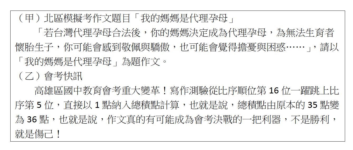 讓我們來跟流行,以上雙文比較一下,雙文比較重點就在共通點,共通點就是考點——顯然甲乙兩個文本的共通點就在「作文」。