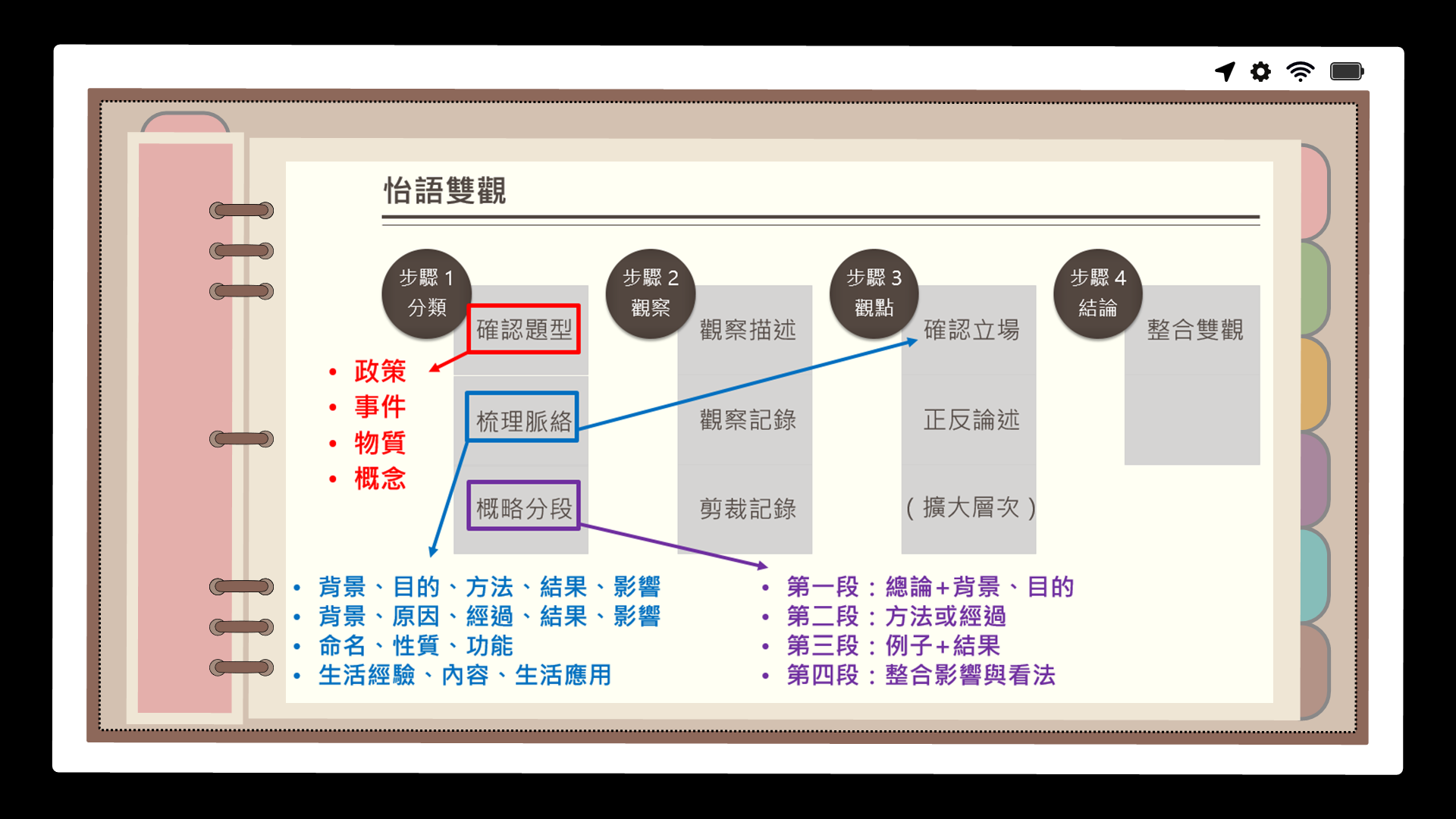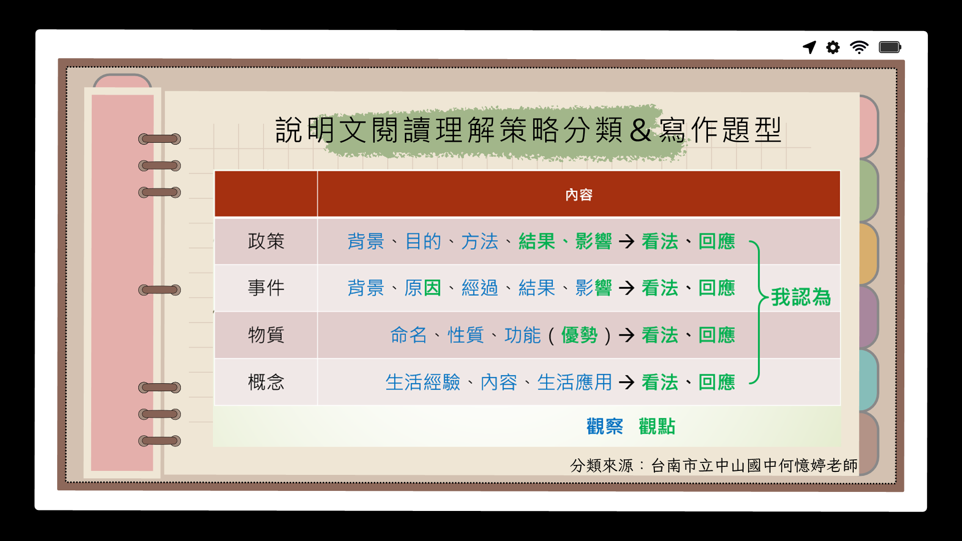 然而,在這麼短的時間內要產出高品質且具有個人觀點的作品實在不簡單。我們可以這麼思考:作文就是向讀者「說明」我們的經驗、感受與看法,因此,採用臺南市中山國中何憶婷老師的說明文理解策略四大分類,對於作文骨架的構成就有大大的幫助。