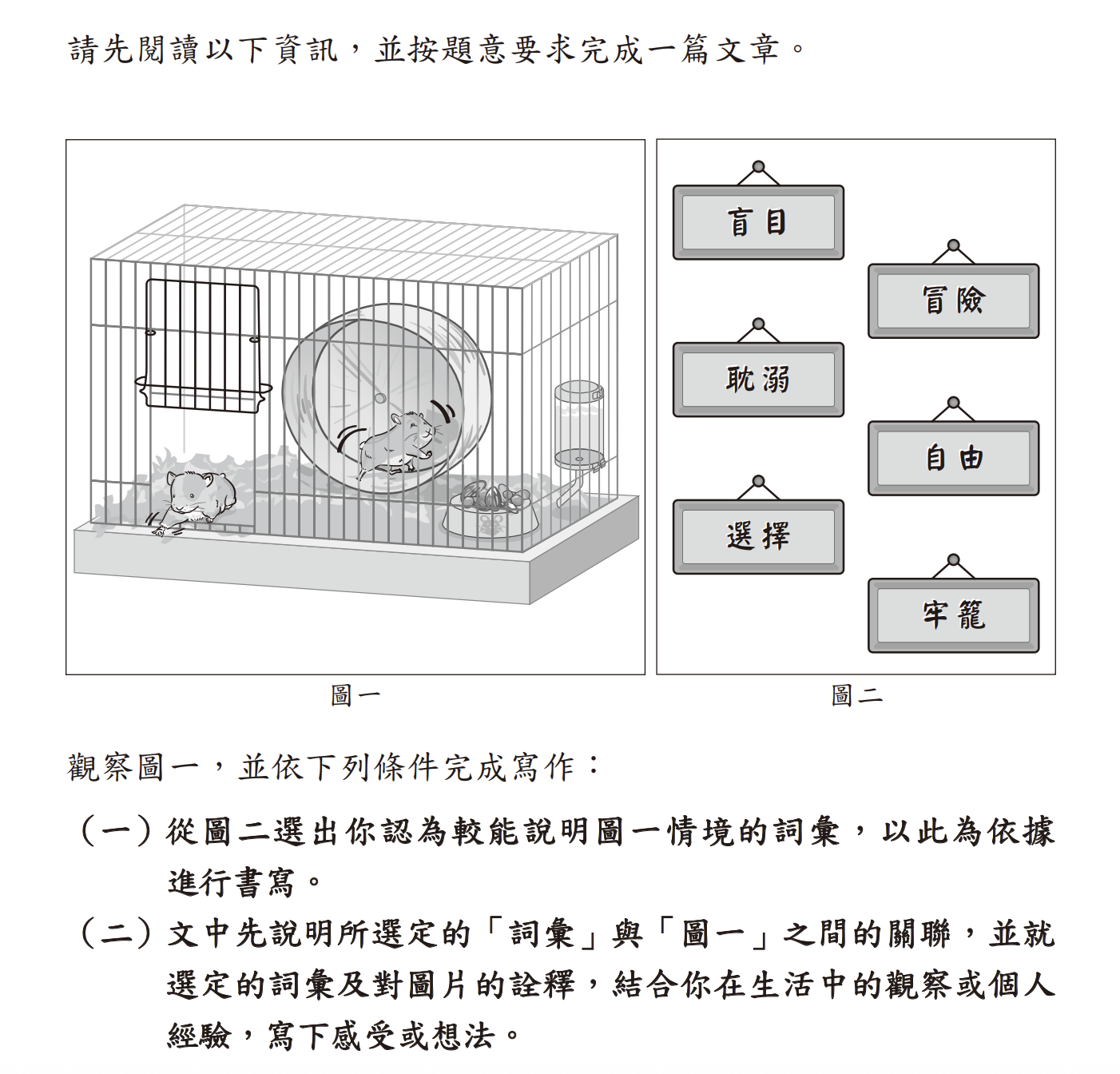 題目除了「滾輪鼠」及「跨出鼠」這兩個情境以外,還給了「牢籠、自由、盲目、選擇、冒險、耽溺」等六個詞彙,選擇自己覺得可以搭配二鼠情境的詞彙完成寫作。我們可以先為「滾輪鼠」及「跨出鼠」下定義,「滾輪鼠」及「跨出鼠」是名字;性質上,前者持續在迴圈中打轉,後者則跳出舒適圈;從功能來說,兩隻倉鼠的表現的是選擇的心境及結果——這時就可以從六個詞彙挑出適合的語詞來做為說明的核心:牢籠與冒險,或是選擇與盲目。這六個辭彙都是抽象概念,因此要對照到人類的生活情境。
