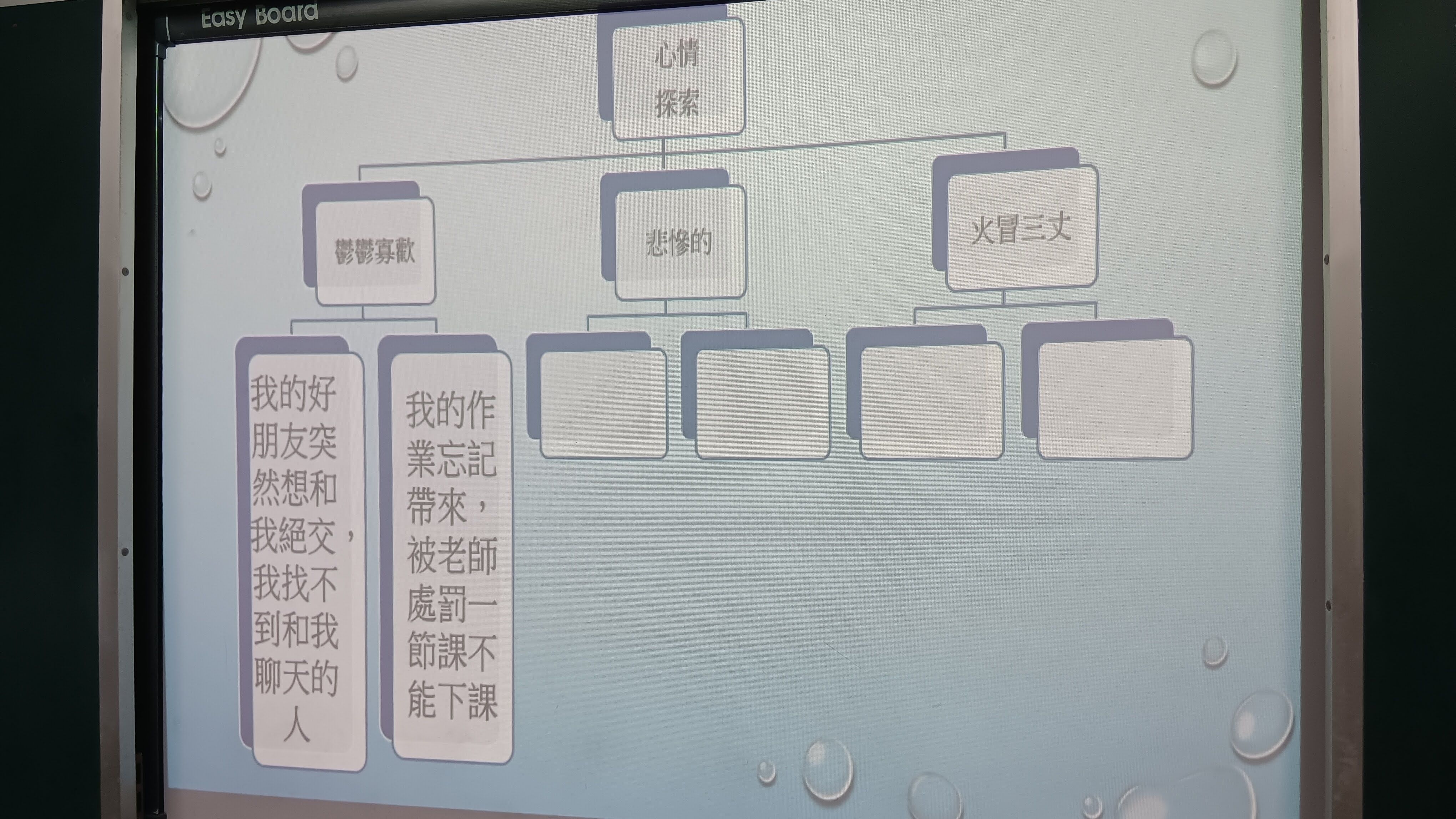 教師可以佈下一個題目,並揭示範例,讓孩子書寫在空白的紙張或小白板上。本次的題目為:「覺察現在的心情是怎樣子的,為什麼?」學生可能的答案為:「現在的心情很緊張,因為我怕被老師點到要發表……」。