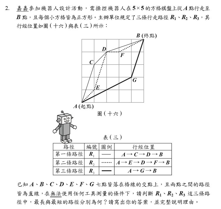傳統的數學問題,往往是計算題,譬如很直接的要學生在三角形、四邊形上證明或是運算。但是素養題型會將相關的理論「藏」在題目裡,學生要在理解題意後,自己找數學工具與方法來解題。下方的例子是寫書法和機器人行走的具體情境,學生可以用代數方法以及幾何方法來說明與解釋。
