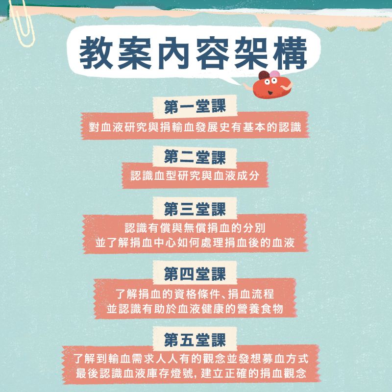 在持續邁向少子化與高齡化的臺灣,年輕血源本應成為醫療用血的支柱,但年輕人的全血捐血量卻出現下滑趨勢。為避免未來出現捐血斷層問題,台灣血液基金會認為「捐血教育」必須向下扎根,因此與親子天下合作打造臺灣第一本「捐血教育」圖文專書《小大人的血液課》,並依據專書內容設計本教案,協助兒少深入了解捐血相關資訊以及其重要性。