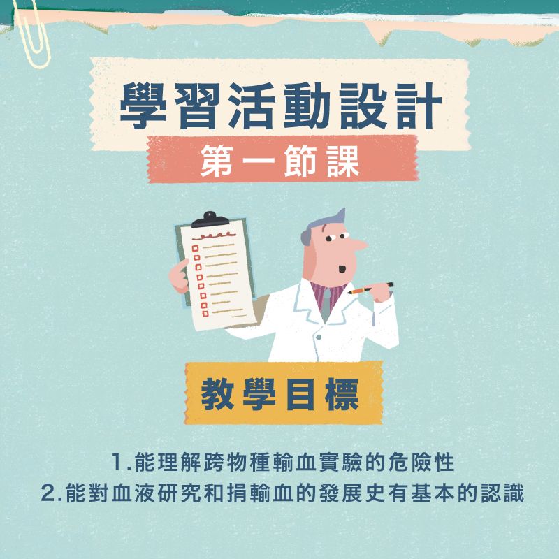 1.以「捐血對人類醫療有何重要性?」作為課程的核心問題,並透過教學投影片的教學設計,搭配繪本閱讀,以及補充資料、學習單等,幫助學生對捐血及其重要性有更進一步的認識。