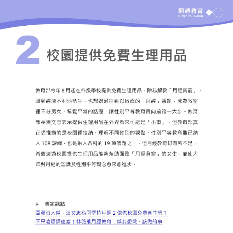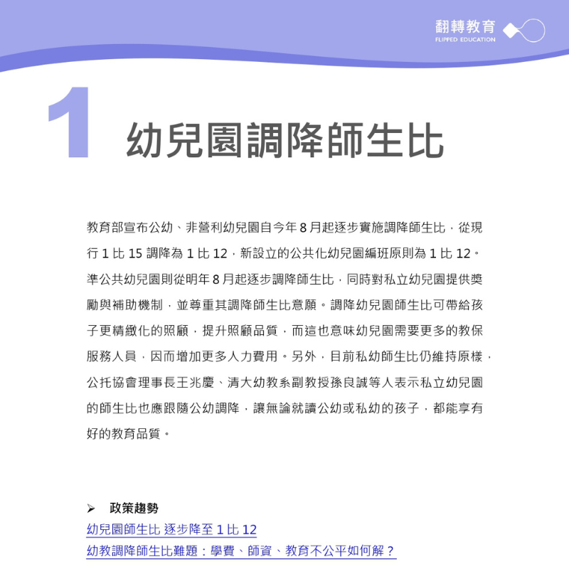 本檔案中同時含主題性的教學資源及系列文章,資源清單可供老師在教室中延伸使用,例如:數位教學工具、幼兒教育示例、性別平等資源包等。透過了解教育趨勢,可以在這不斷變革的教育政策中持續更新自己,也可以檢視自己踏上的教育之路,進一步嘗試在實際備課、規劃教材,協助孩子有更好的學習。