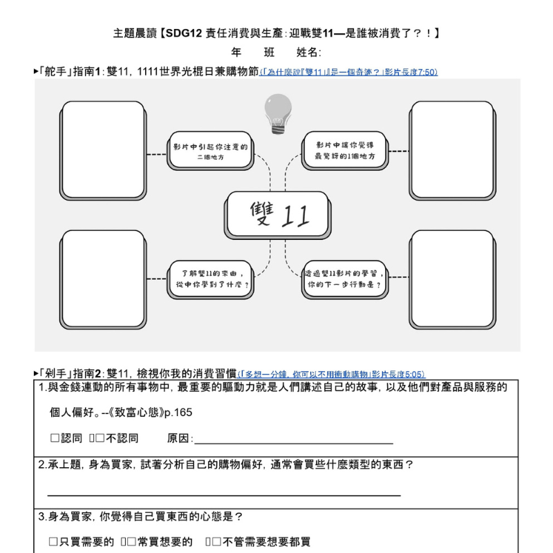 SDGs是聯合國於2015年提出的「2030永續發展目標」,其中第12項為「責任消費與生產」,意為確保採用永續的消費和生產模式。此教案設計將利用15分鐘的晨讀時間,搭配雙11帶孩子認識三件事: