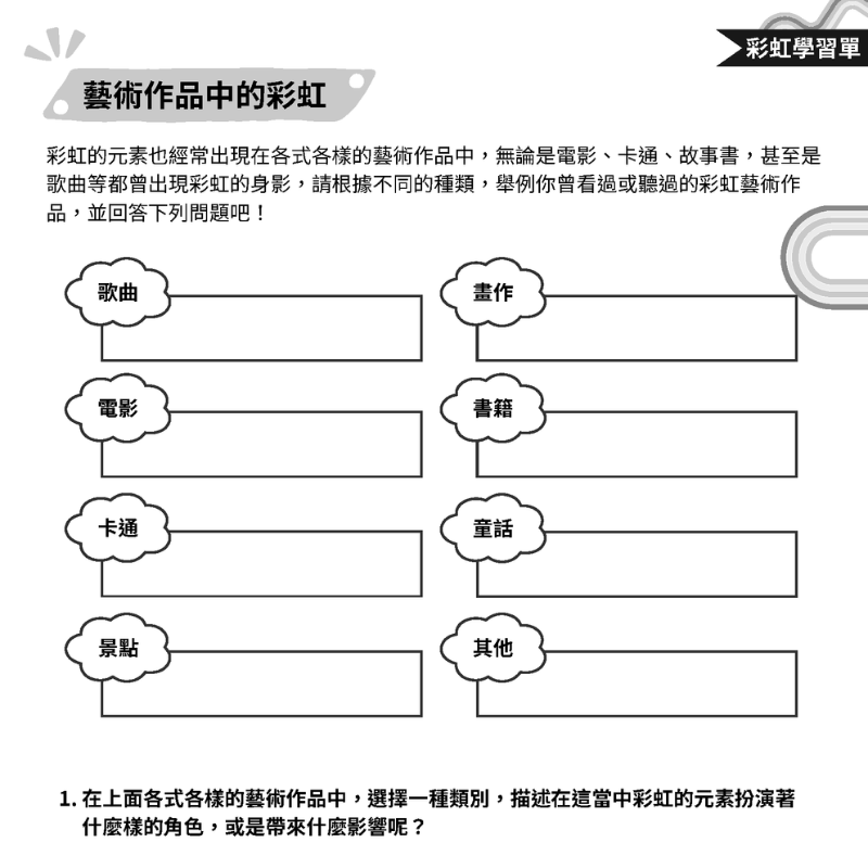 此份教學資源搭配《彩虹》一書,書中一共有五個重點章節,而隨著書中不同的章節,有搭配專屬的學習單和題型設計,除了能讓孩子對於書中內容有更深刻地了解與體會,也期待透過多元的提問,刺激孩子的思考。其中,也有讓孩子去建立生活當中與彩虹的關聯,將彩虹的象徵與意義帶入孩子的真實世界。