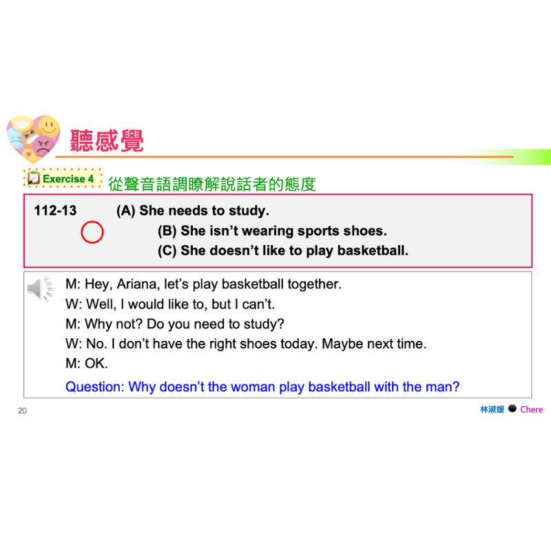 此外,學生對語調、情境線索與說話者意圖的敏感度不足,也會影響理解深度與判斷力。因此,僅靠「多聽」還不夠,必須透過有系統的方法訓練,才能真正建立解題自信與應試能力。