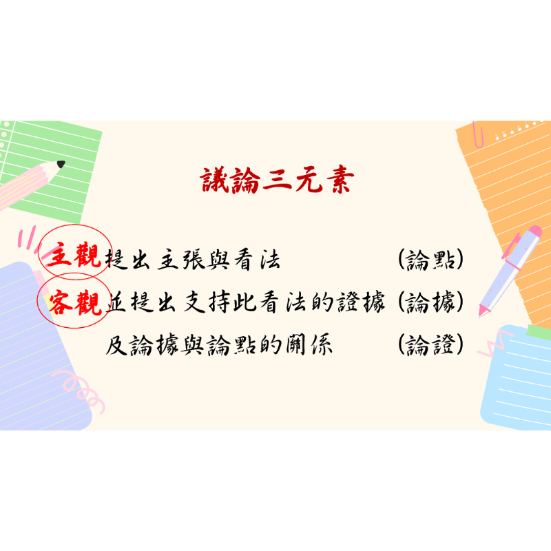 高雄市立七賢國中蔡思怡老師精心整理的《會考定心丸》閱讀理解策略資源,針對社會、自然與數學科精選重點,透過簡明清晰的邏輯架構,如「總分結構」、「邏輯字詞提示」、「議論三要素」等方式,引導學生快速掌握題意,提升理解與判讀效率。也分享小撇步: