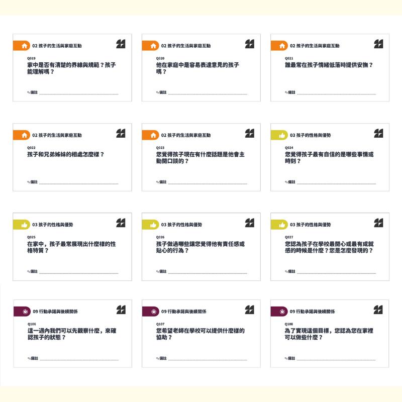 本教學資源每個提問設計,貼近班級經營節奏,包含班親會、學習挑戰、人際衝突等常見場景,並以「協助家長理解孩子、共同解決問題」為核心,而非僅是詢問家長的期待或轉達單方的訊息。