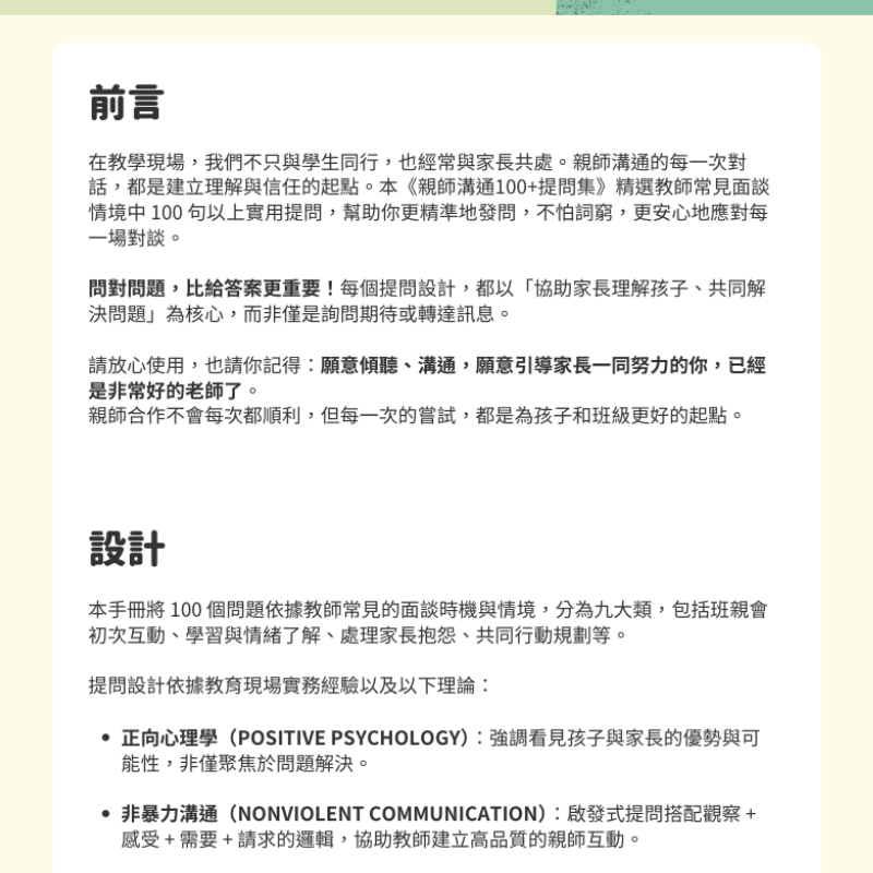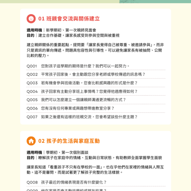 使用時不需要一次問許多問題,也不需要回答家長的每一個焦慮。請記得,願意傾聽、溝通,願意引導家長一同努力的你,已經是非常好的老師了。親師合作不會每次都順利,但每一次的嘗試,都是為孩子和班級更好的起點。