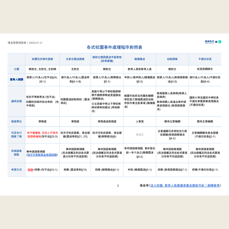 面對動輒進入調查程序之校園衝突,以及性平、霸凌、校事會議、職場霸凌、教保條例、不適任校長六套法規,張金章主任為文分享教育人員應具備何種素養及應對方針,並不斷更新各式校園事件處理程序對照表,讓更多教育工作者與時俱進,妥善應對「程序不備,實體不論」之校園事件。