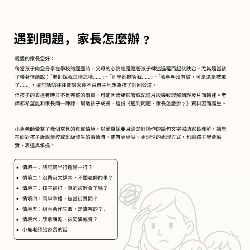 《家長怎麼辦本》不是一份「告訴你怎麼做才對」的指南,而是一封寫給每一位關心孩子的家長的溫柔提醒:孩子還在學習如何說清楚事情的經過,老師也還在努力兼顧每一個孩子。願我們一起傾聽、理解、合作——讓誤會減少,支持增加。